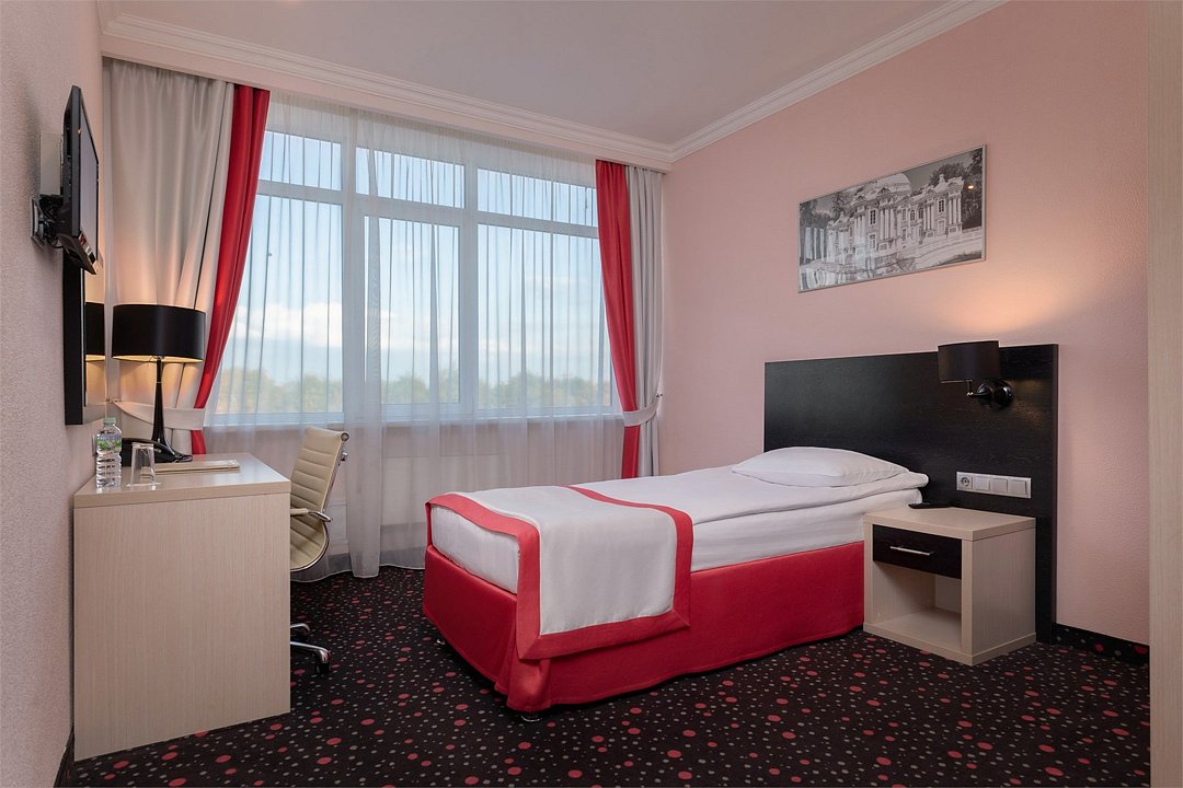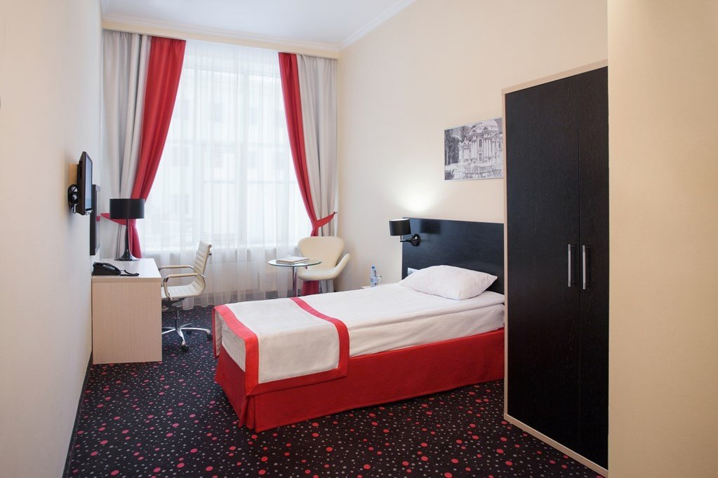 Экономный вариант для проживания одному, номера незначительно могут отличаться по площади от 18 до 23 м². Номер укомплектован индивидуальным набором (мыло, шампунь, гель для душа). По запросу сотрудники предоставят гладильную доску и утюг, швейный набор, обогреватель.Услуги и удобства