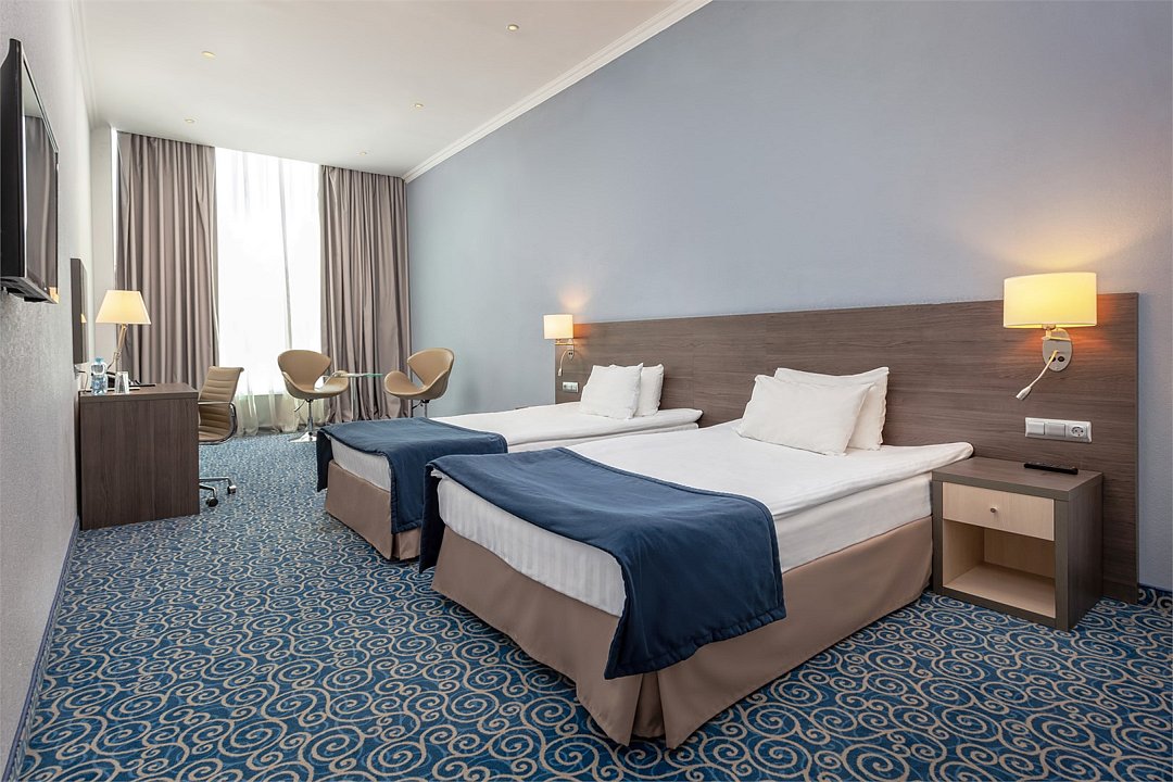 Номера категории стандарт "твин" могут незначительно отличаться друг от друга по площади от 18 до 27 м². Номер укомплектован индивидуальным набором (мыло, шампунь, гель для душа). По запросу сотрудники предоставят гладильную доску и утюг, швейный набор, обогреватель.Услуги и удобства