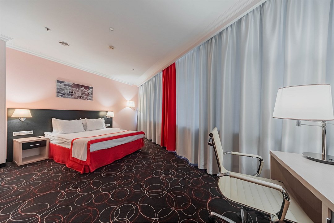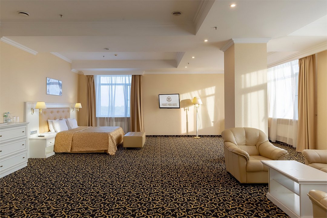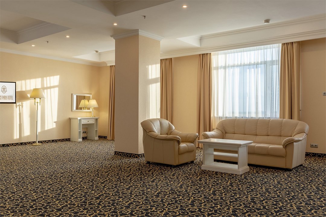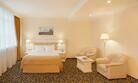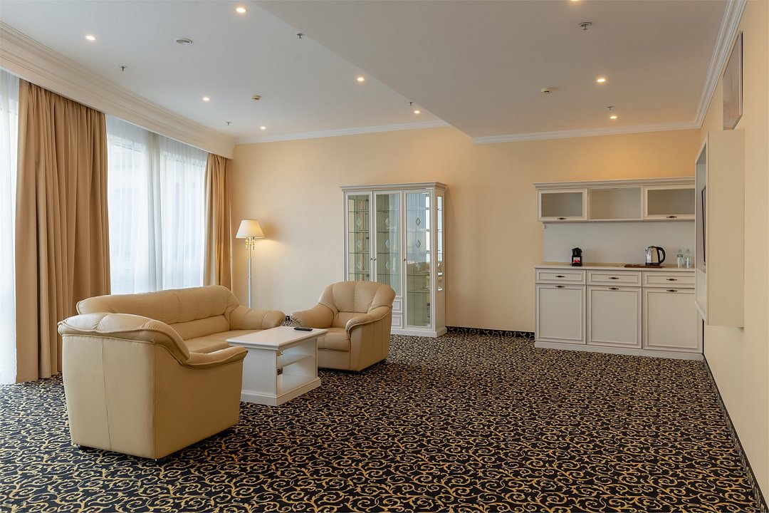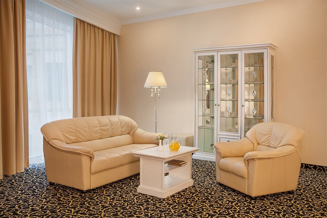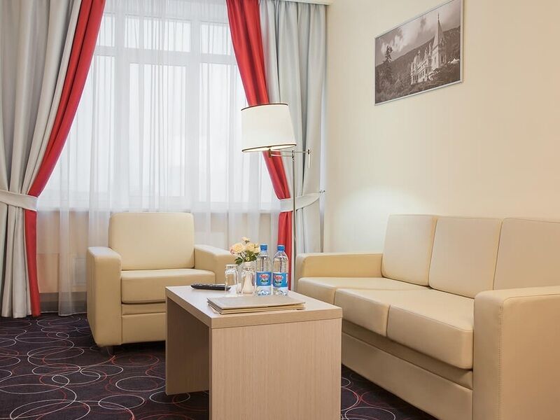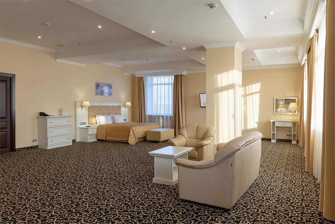 Уютный номер в классическом стиле. Пространство комнаты разделено на просторную спальню с панорамными окнами и гостиную с обеденным столом. Большая ванная комната (14 м²) с вместительной душевой кабиной. Номер укомплектован индивидуальным набором (мыло, шампунь, гель для душа, зубной набор, набор для бритья, халаты). По запросу сотрудники предоставят гладильную доску, утюг, швейный набор.Услуги и удобства