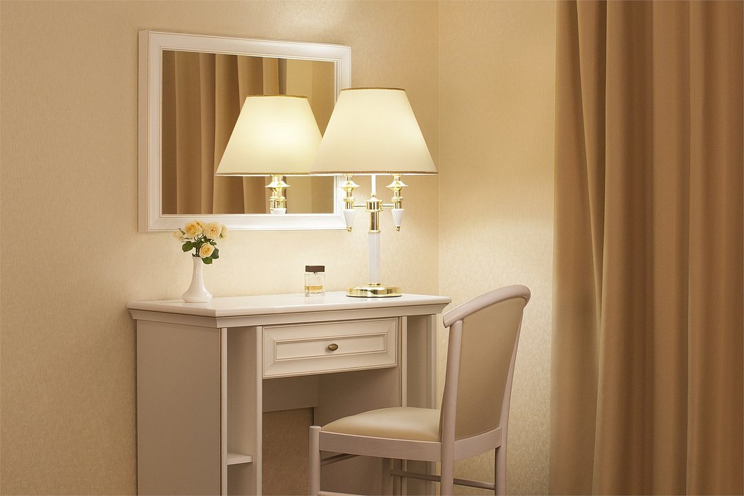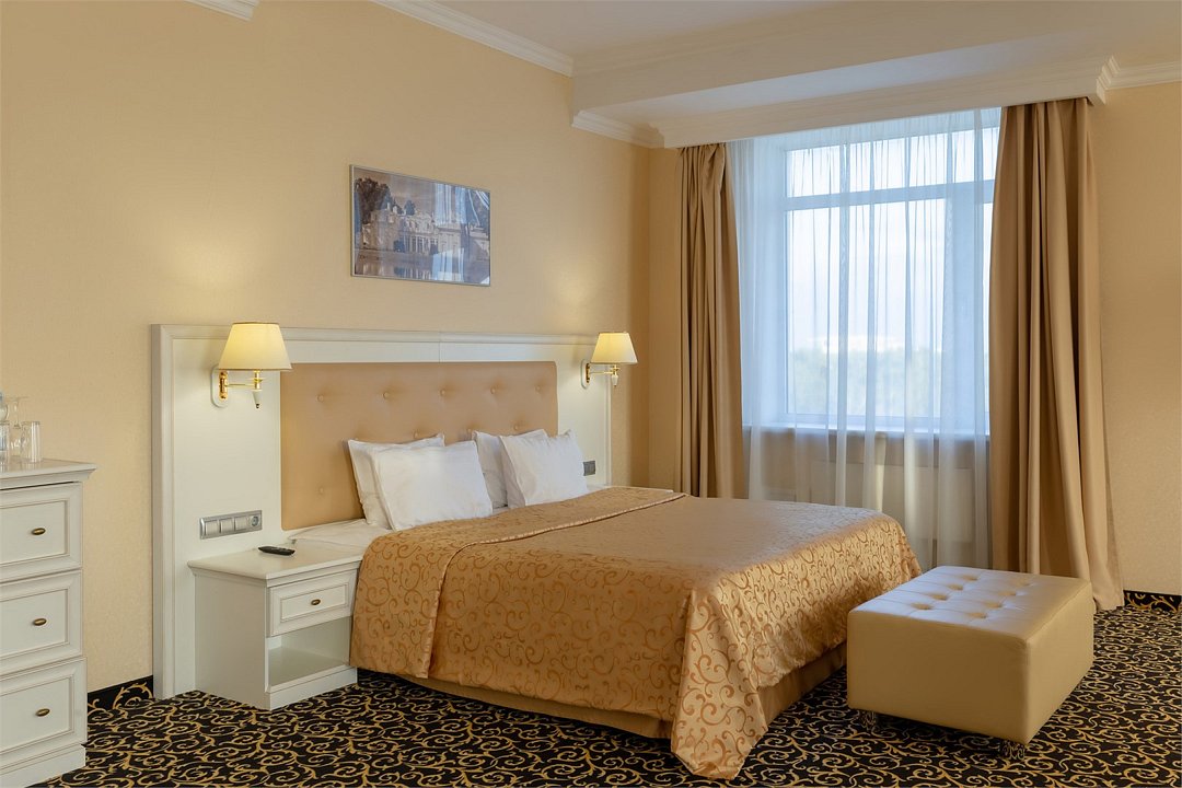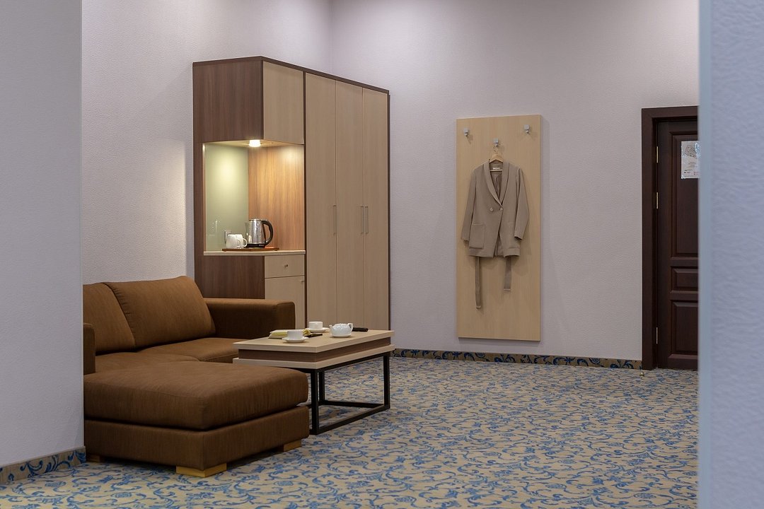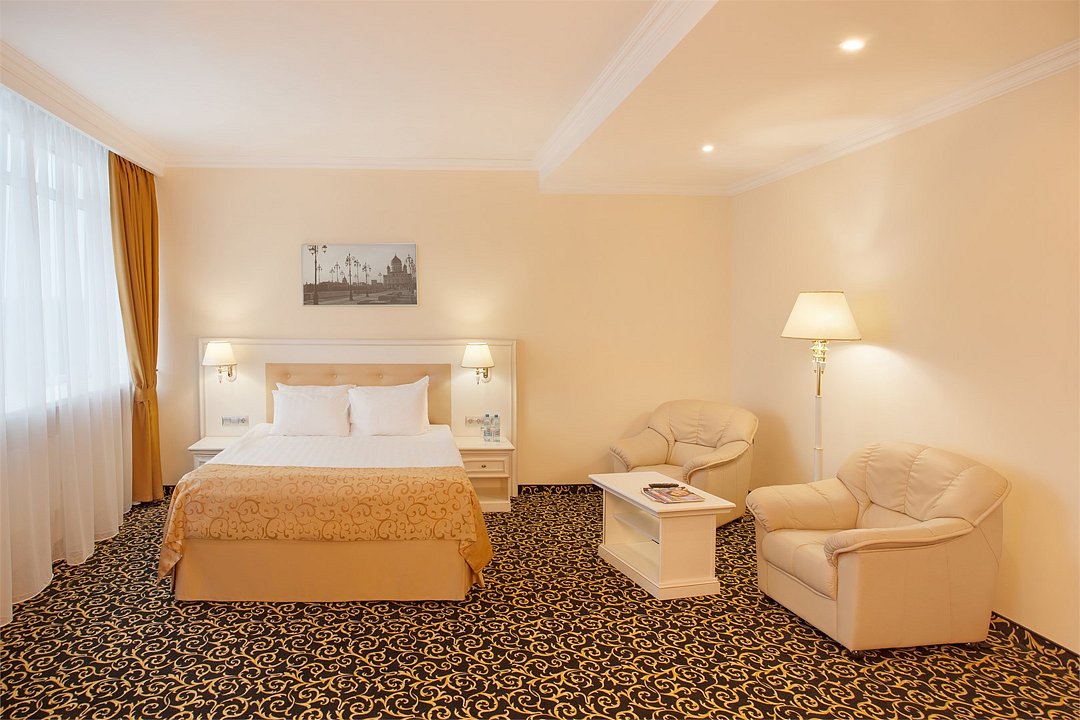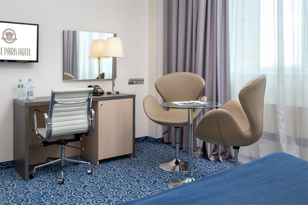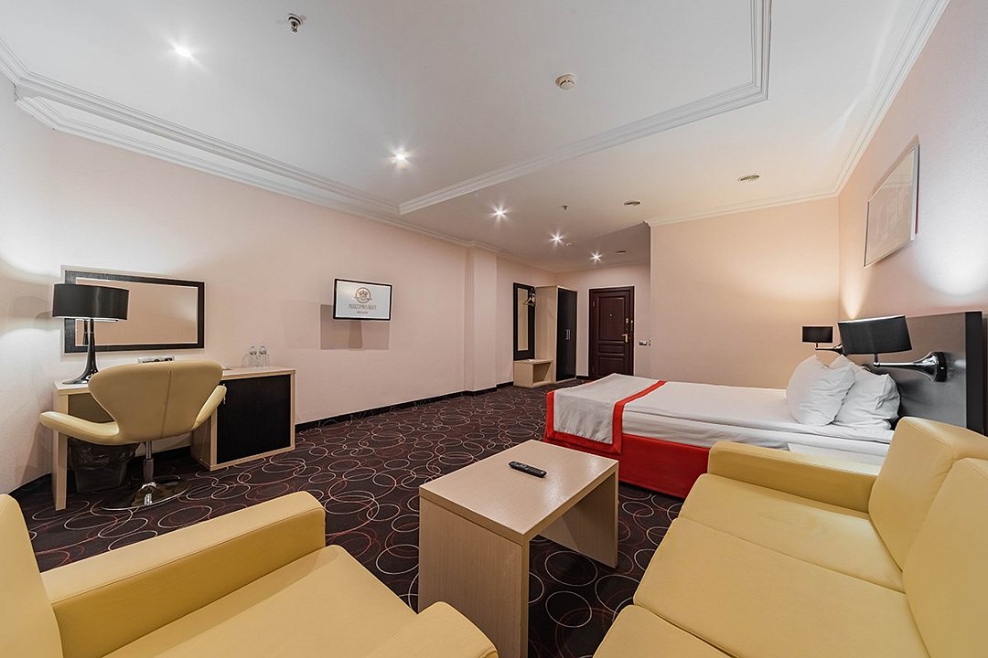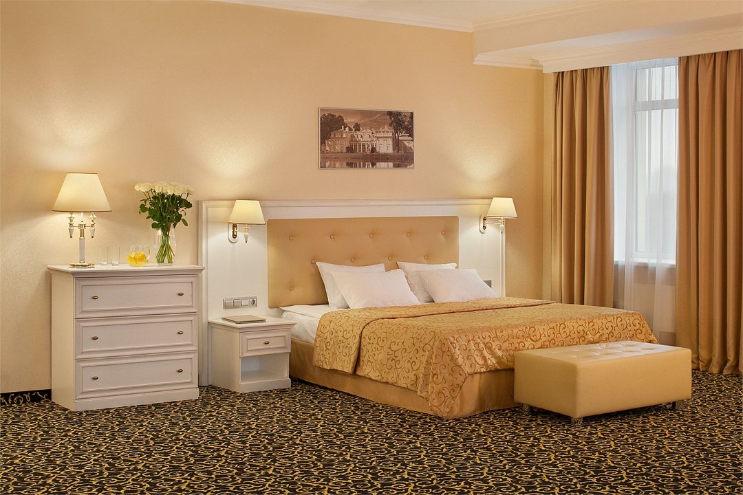 Уютный номер в классическом стиле. Пространство комнаты разделено на просторную спальню с панорамными окнами и гостиную с обеденным столом. Большая ванная комната (14 м²) с вместительной душевой кабиной. Номер укомплектован индивидуальным набором (мыло, шампунь, гель для душа, зубной набор, набор для бритья, халаты). По запросу сотрудники предоставят гладильную доску, утюг, швейный набор.Услуги и удобства