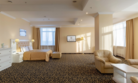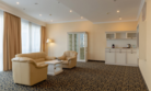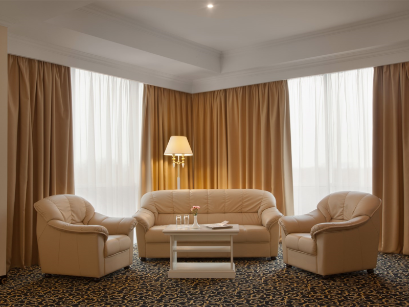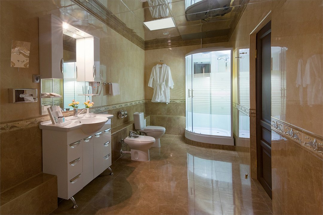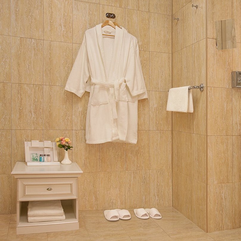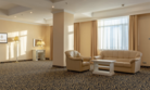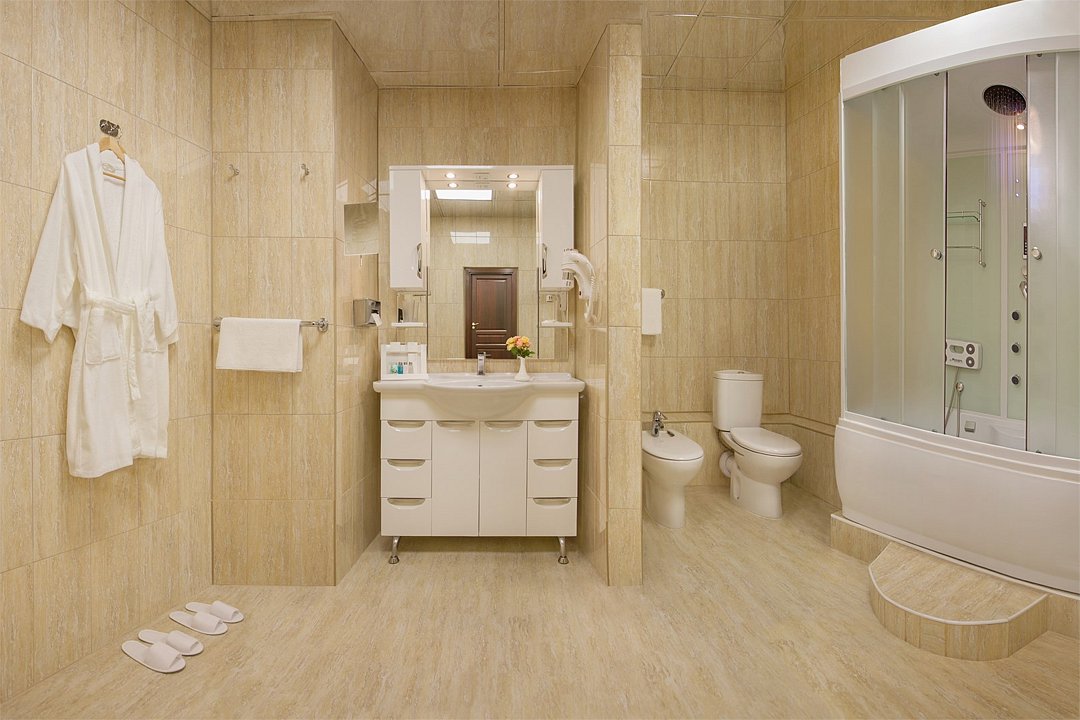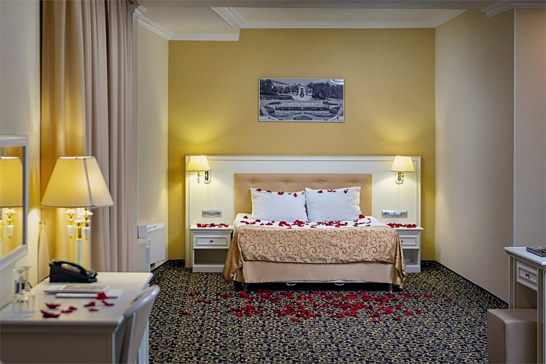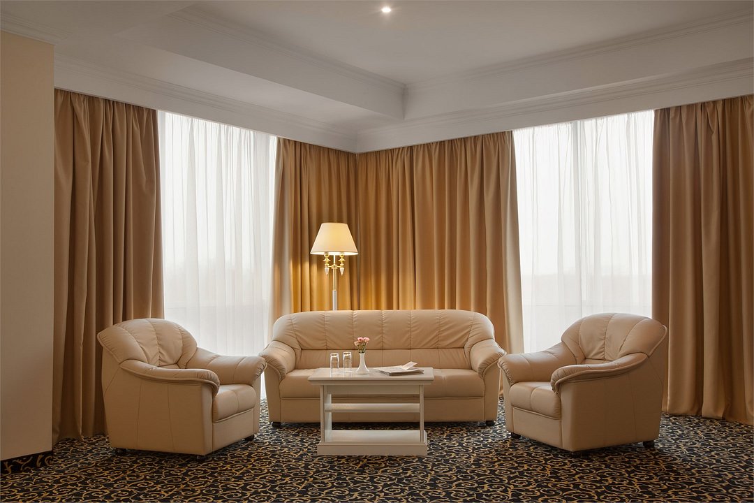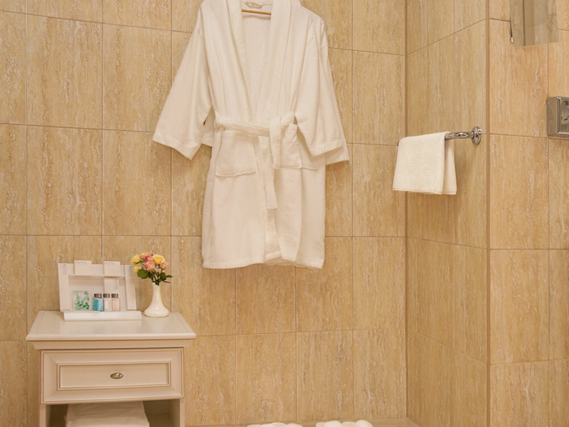 Уютный номер в классическом стиле. Пространство комнаты разделено на просторную спальню с панорамными окнами и гостиную с обеденным столом. Большая ванная комната (14 м²) с вместительной душевой кабиной. Номер укомплектован индивидуальным набором (мыло, шампунь, гель для душа, зубной набор, набор для бритья, халаты). По запросу сотрудники предоставят гладильную доску, утюг, швейный набор.Услуги и удобства