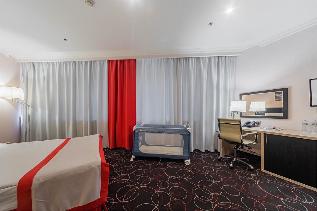 спутниковое телевидение, Wi-Fi, настольные лампы, электронные замки, ванная комната, банные полотенца, тапочки, косметические средства, двуспальная кровать, ортопедический матрас, тумбы, шкаф для одежды, вешалки, журнальный столик, письменный стол, багажная тумба, зеркало, обслуживание номеров, информационная карта, меню, сейф, ковровое покрытие, душ, вид на город, кулер на этаже, кресло, китайский канал, вид во двор, окна выходят в атриум отеля, высокие потолки, стаканы, стул, туалетные средства, туалет, внутренний телефон, телевизор с плоским экраном, мини-холодильник, номер для некурящих, услуги прачечной (платно), бутилированная вода, мыло, можно с питомцамиВ номере