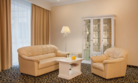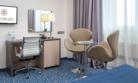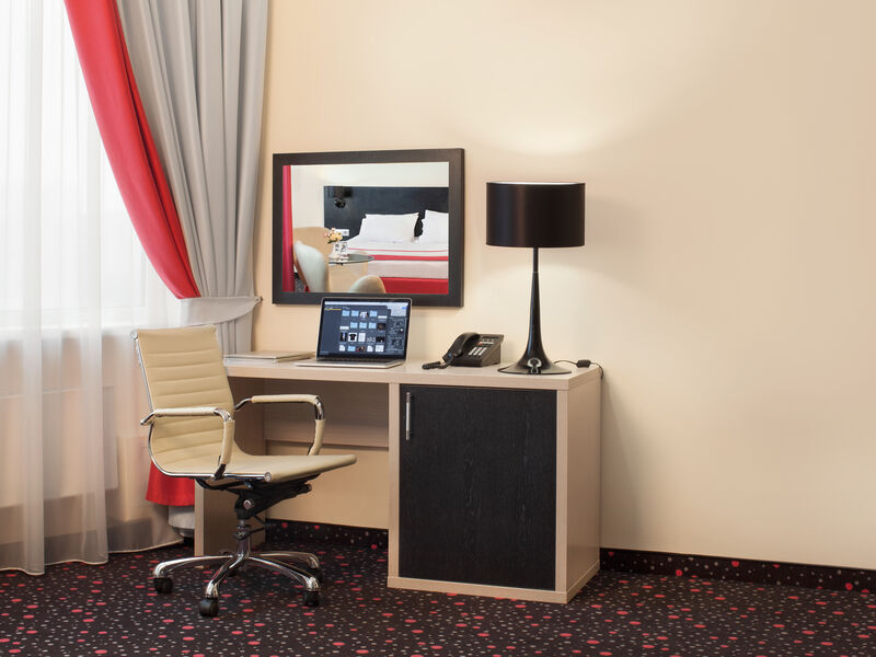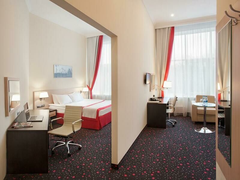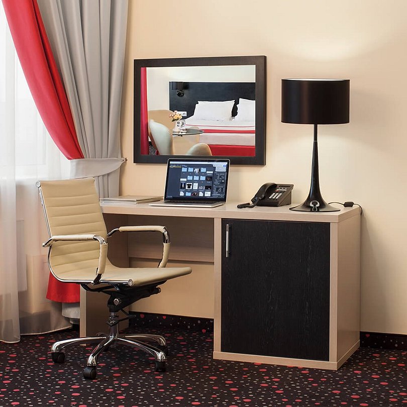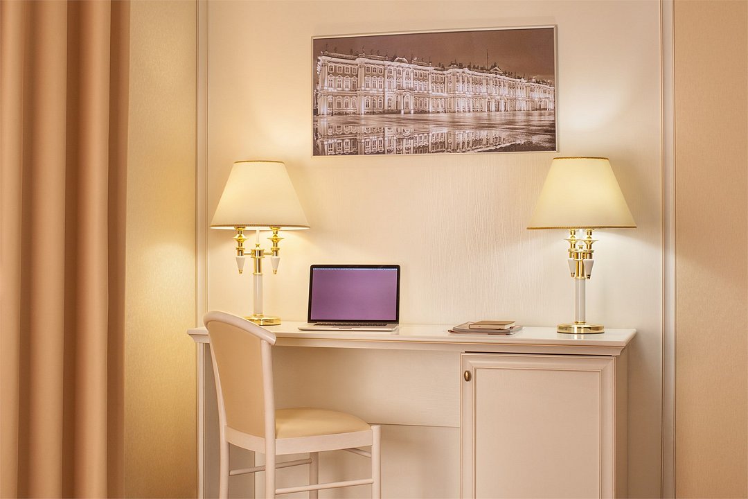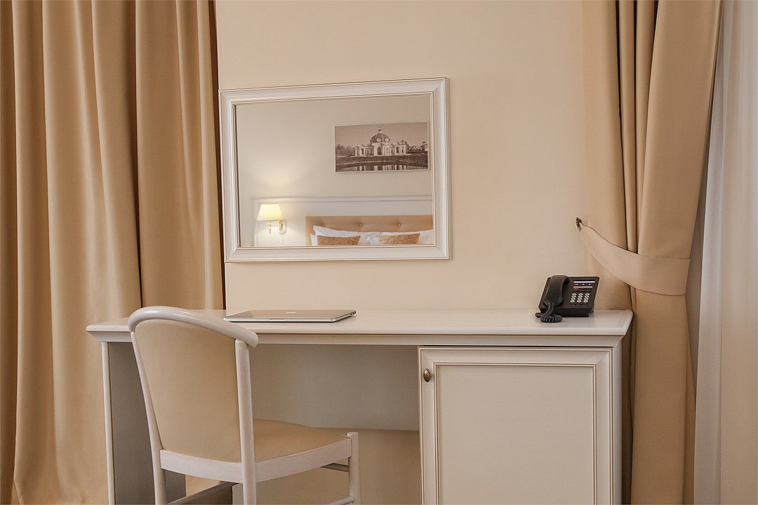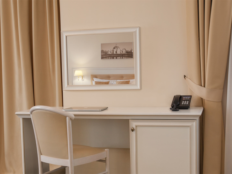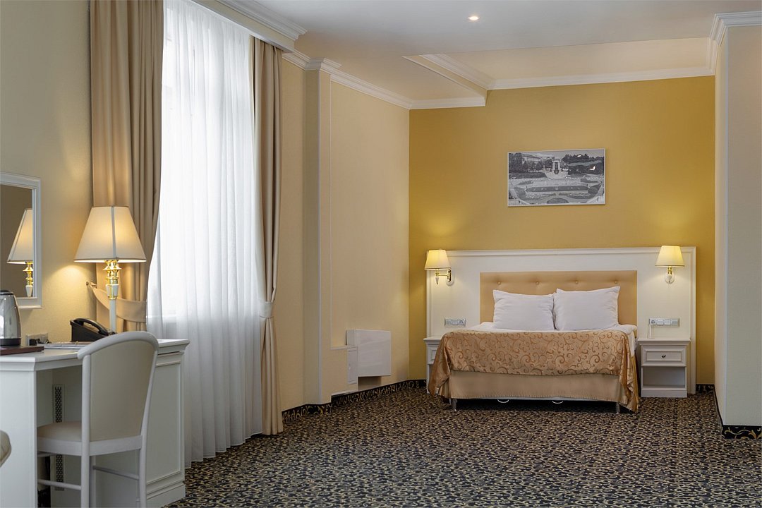 Просторный номер в классическом стиле. Спальня, рабочая и гостиная. Номера могут незначительно отличаться друг от друга по площади от 36 до 44 м². Номер укомплектован индивидуальным набором (мыло, шампунь, халат, гель для душа). По запросу сотрудники предоставят зубной набор, гладильную доску, утюг, швейный набор, обогреватель и чайник.Услуги и удобства