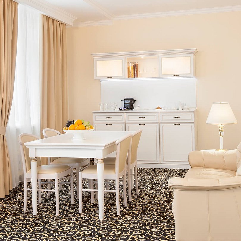 Самый большой номер в классическом стиле. Просторная спальня, гостиная и кухонный уголок. Большая ванная комната (18 м²) с джакузи и душевой кабиной. Номер укомплектован индивидуальным набором (мыло, шампунь, гель для душа, зубной набор, набор для бритья, халат). По запросу сотрудники предоставят гладильную доску, утюг, швейный набор.Услуги и удобства