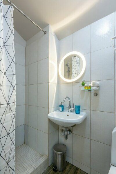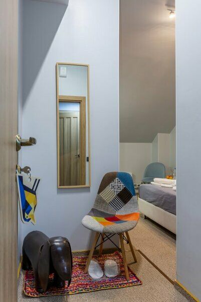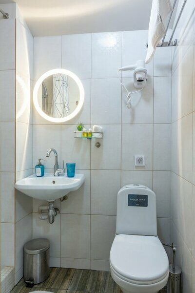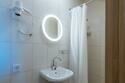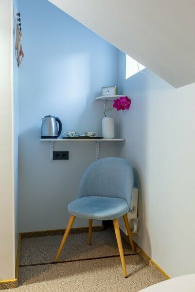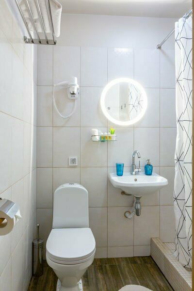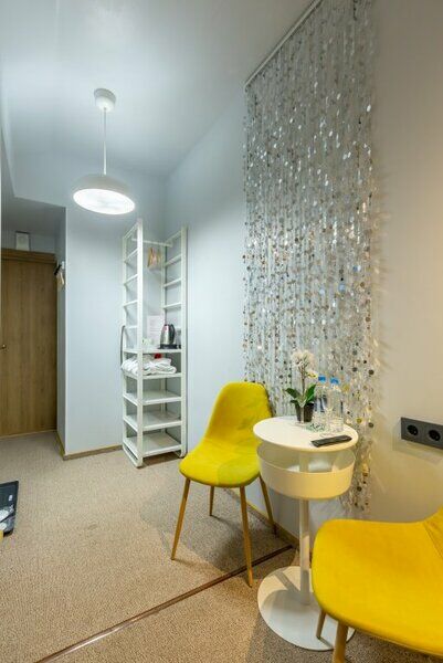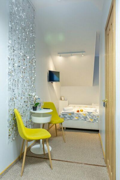 В номере большая двуспальная кровать, полка-столик и два стула, есть чайник. Подойдет для проживания 2 гостей, не более. Номер был хорошо убран, чистое свежее белье. Собственный санузел и душ. Насчет шумоизоляции сложно сказать, соседей мы не слышали, но и не уверены, что они у нас были :))