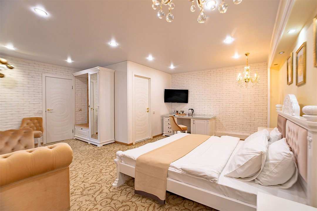 Wi-Fi, фен, электронные замки, утюг, санузел, халаты, тапочки, косметические средства, кровать «King size», гладильная доска, шкаф для одежды, вешалки, журнальный столик, письменный стол, зеркало, чайный набор, сейф, чайник, ковровое покрытие, отопление, душ, кресло, вид во двор, высокие потолки, стаканы, туалетные средства, туалет, сплит-система, диван-кровать, телевизор с плоским экраном, мини-холодильник, номер для некурящих, рабочий столВ номере