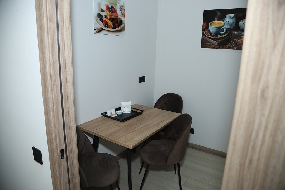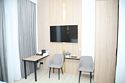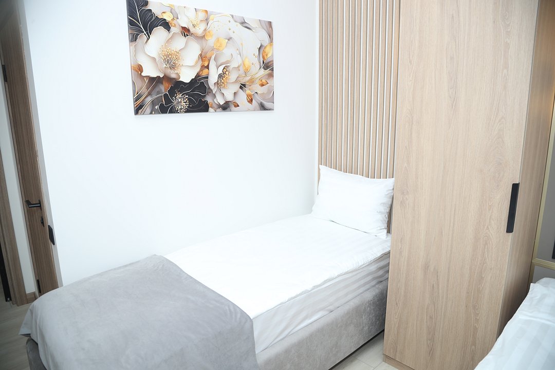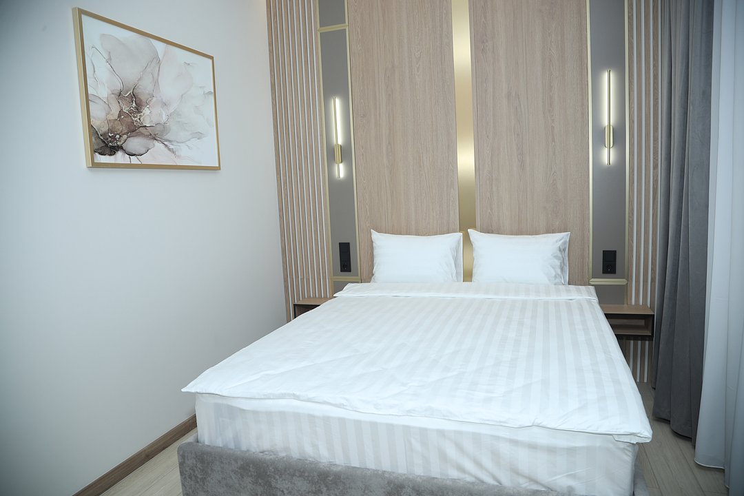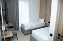 Номер с общей площадью не менее 18–20 м² состоящий из одной большой комнаты с двуспальной кроватью размером 180×200 и односпальная кровать 90х200, рабочее место (стол), приборы для приготовления чая или кофе, электрический чайник.