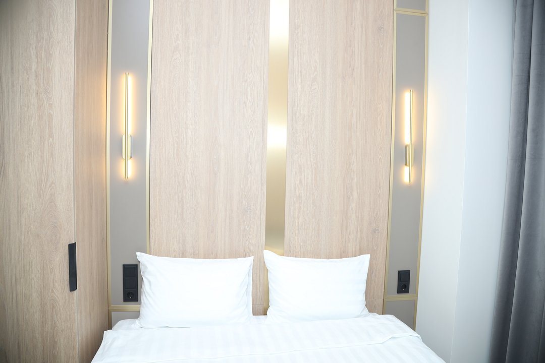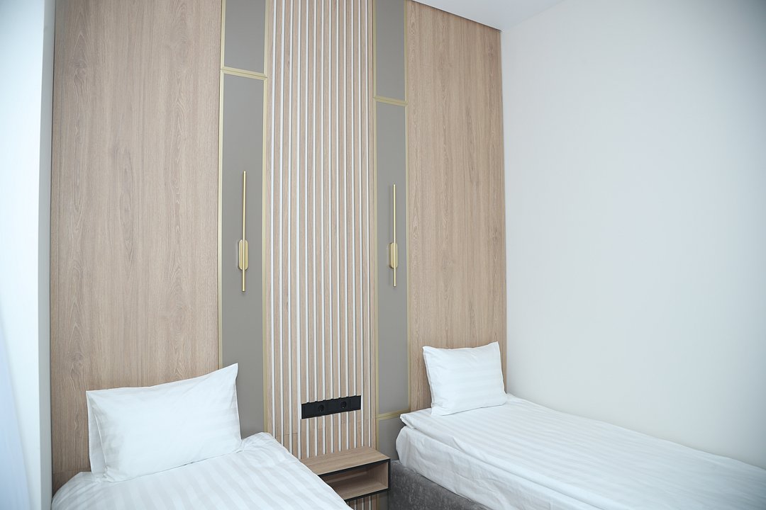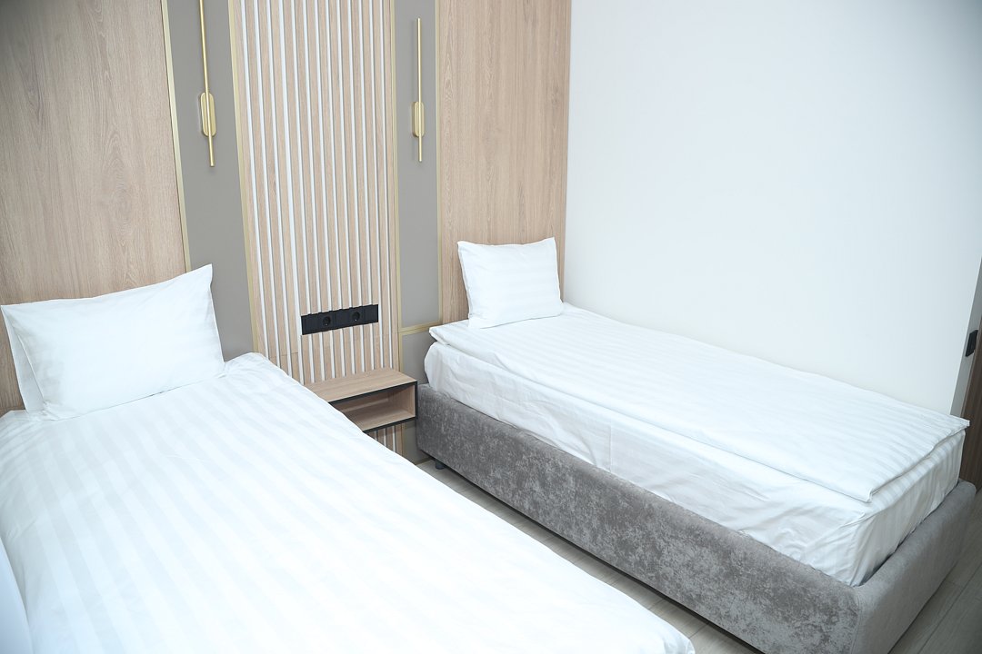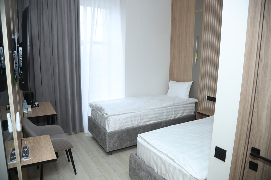 Однокомнатный номер в гостинице общей площадью не менее 19 м², рассчитанный на проживание одного/двух человек. В номере две раздельные кровати размером 90×200, рабочее место, приборы для приготовления чая или кофе, электрический чайник.