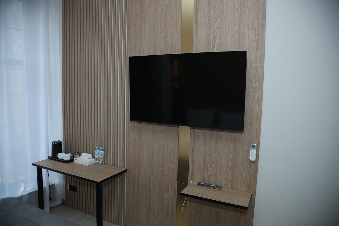 Звуконепроницаемые окна, интернет, телефон, кондиционер, кровать с ортопедическими матрасами, качественным белым постельным бельем, одеялами и подушками, большой шкаф для одежды. Современный LCD-телевизор с множеством российских и европейских телеканалов, столик, большой шкаф для одежды.
