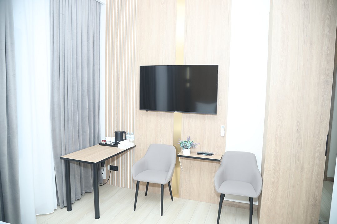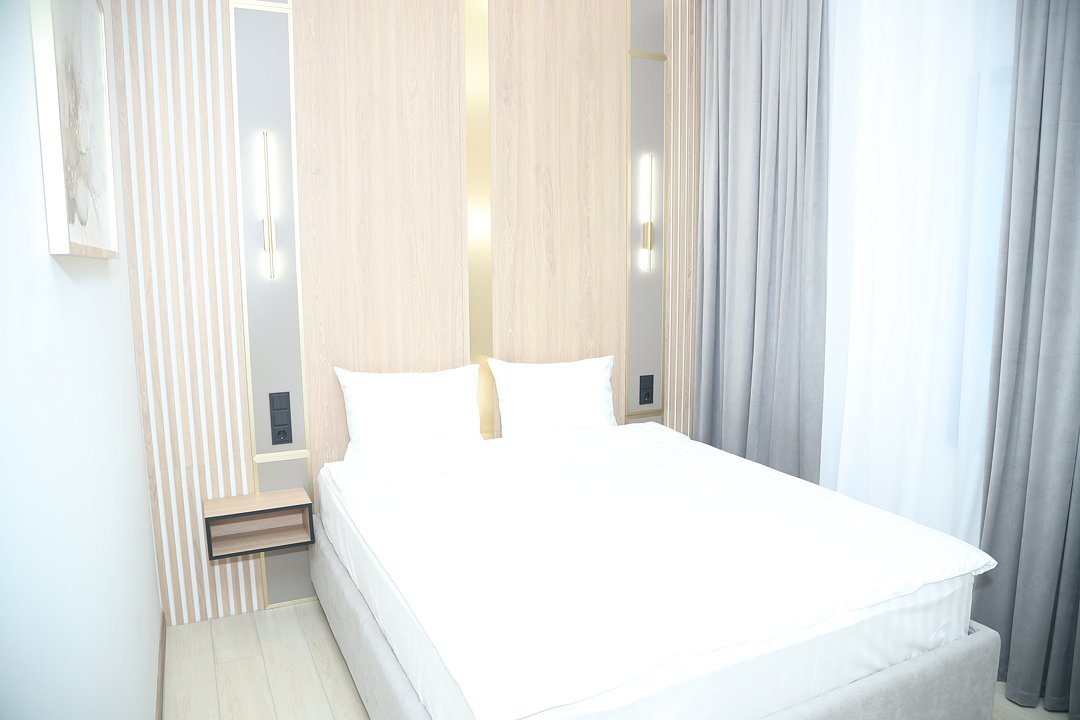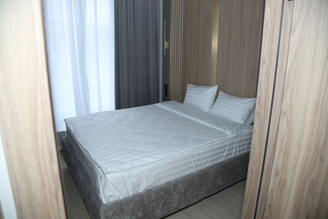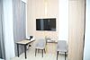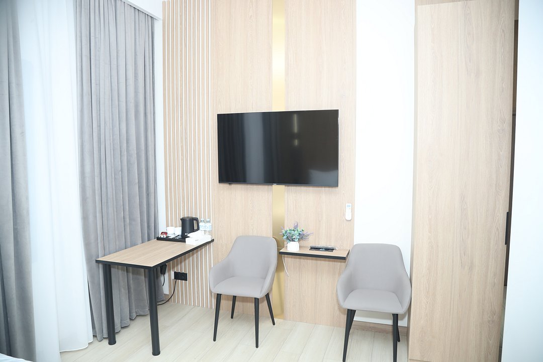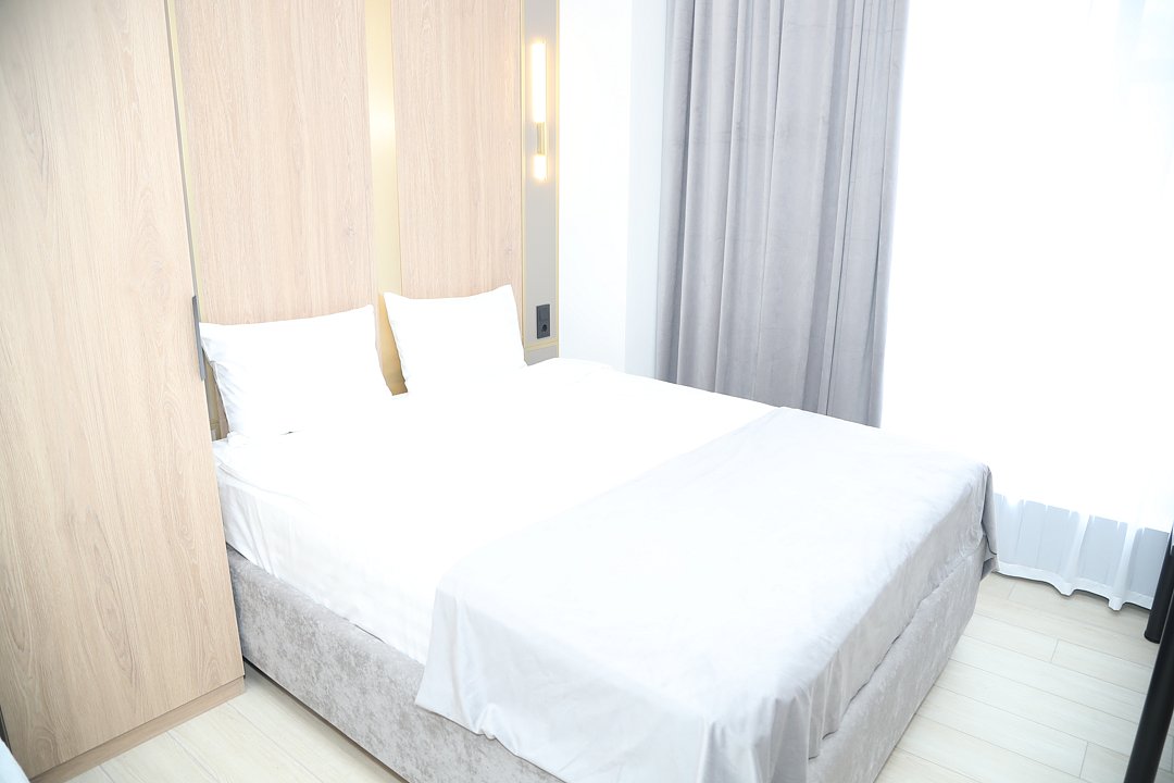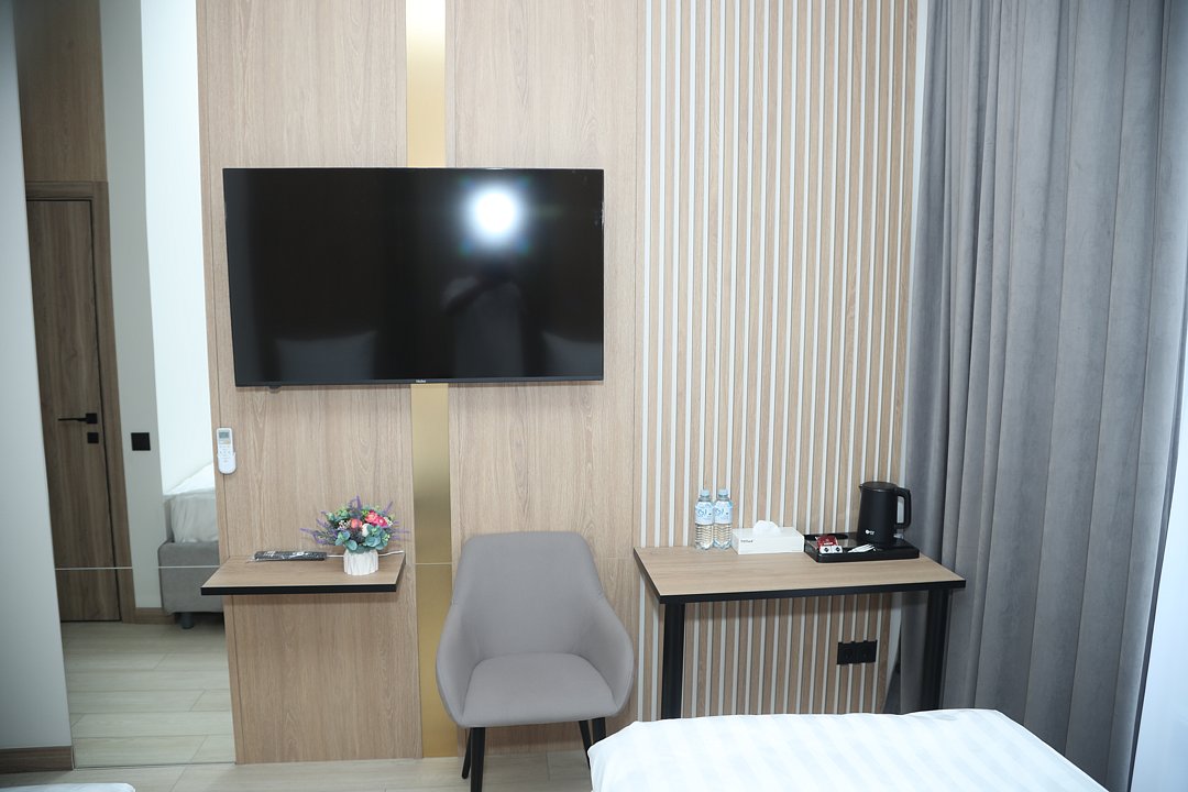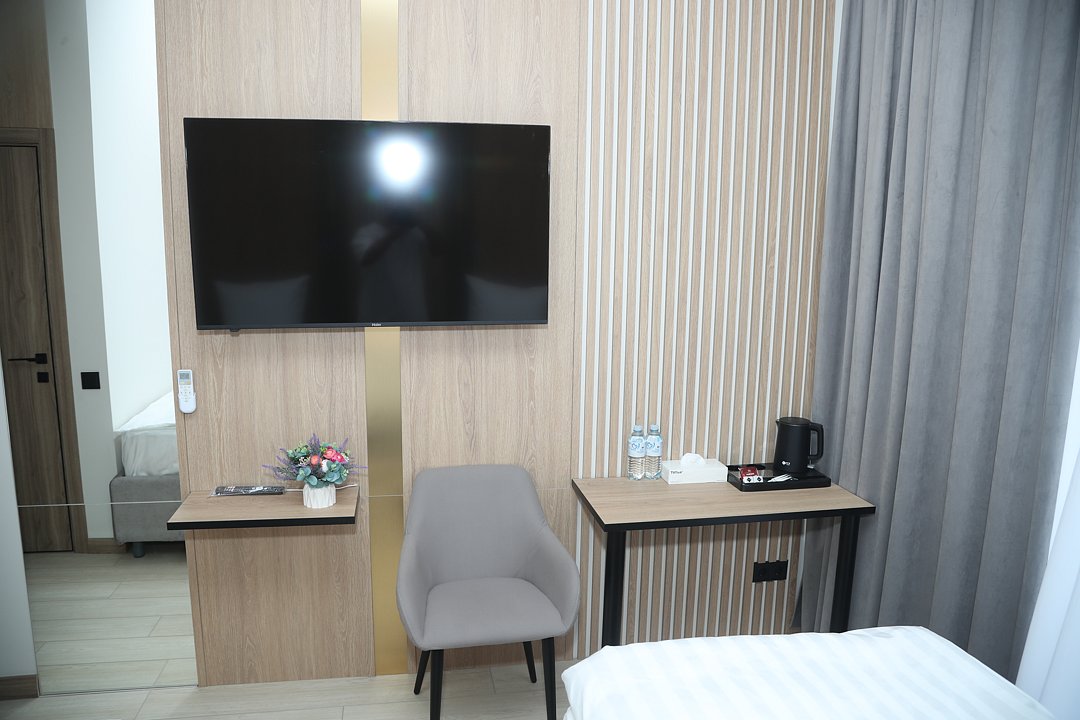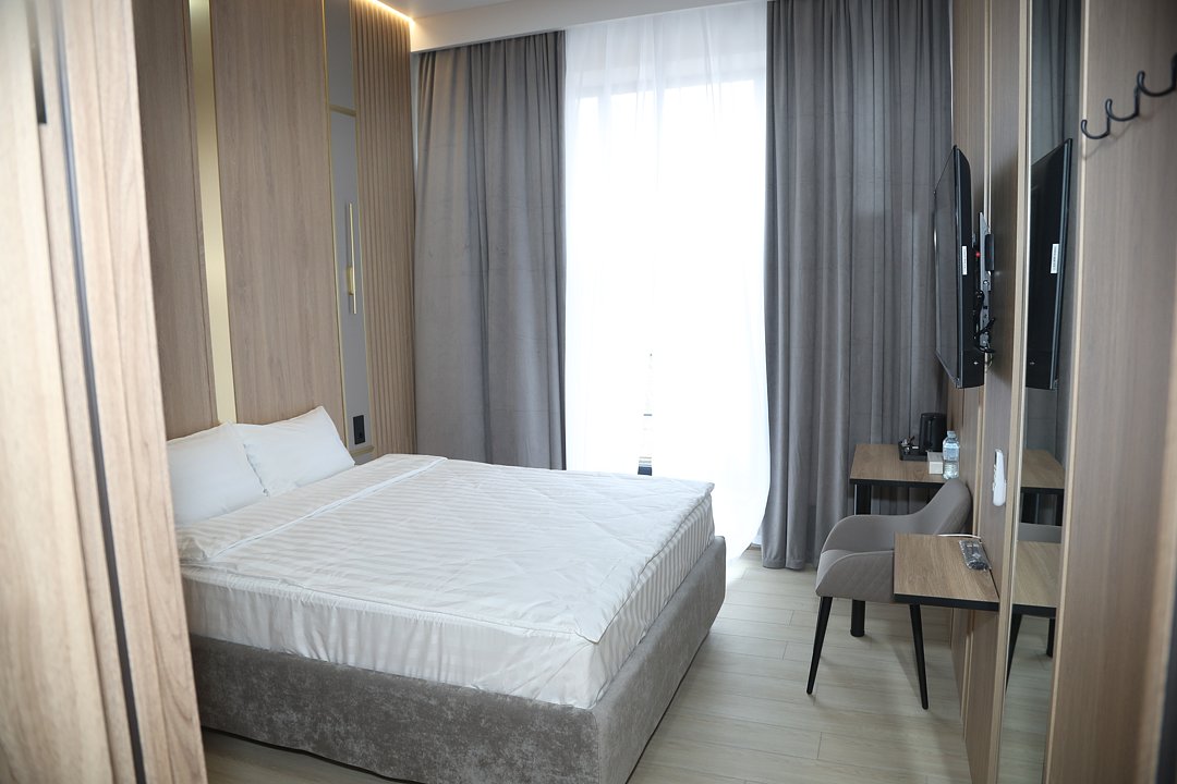 Звуконепроницаемые окна, интернет, телефон, кондиционер. Кровать с ортопедическими матрасами, качественным белым постельным бельем, одеялами и подушками, большой шкаф для одежды. Современный LCD-телевизор с множеством российских и европейских телеканалов, столик, стул.