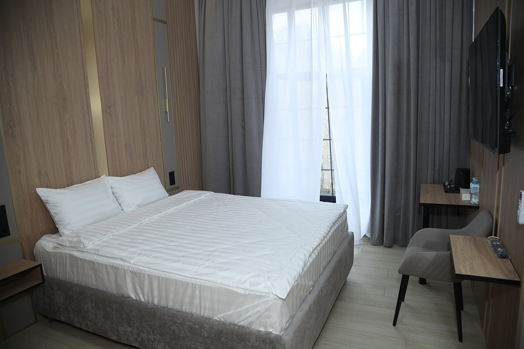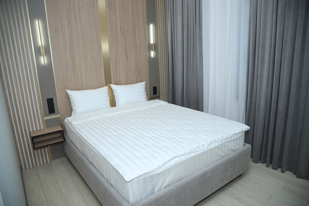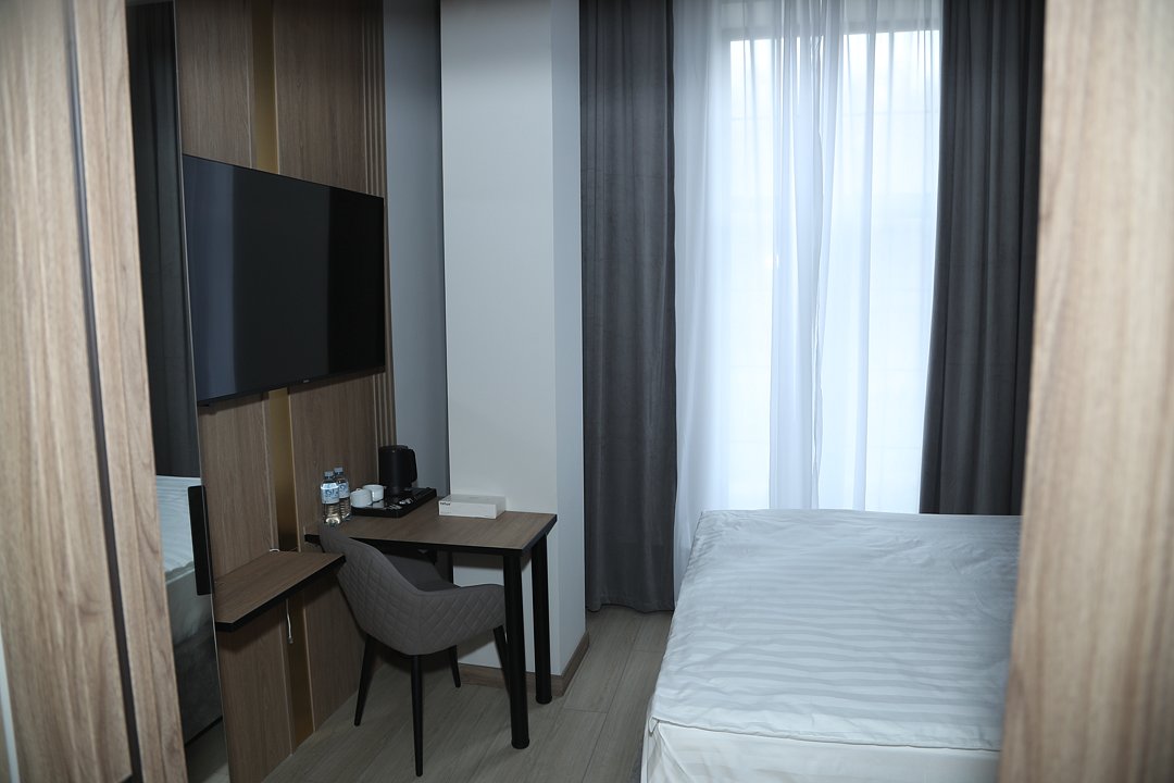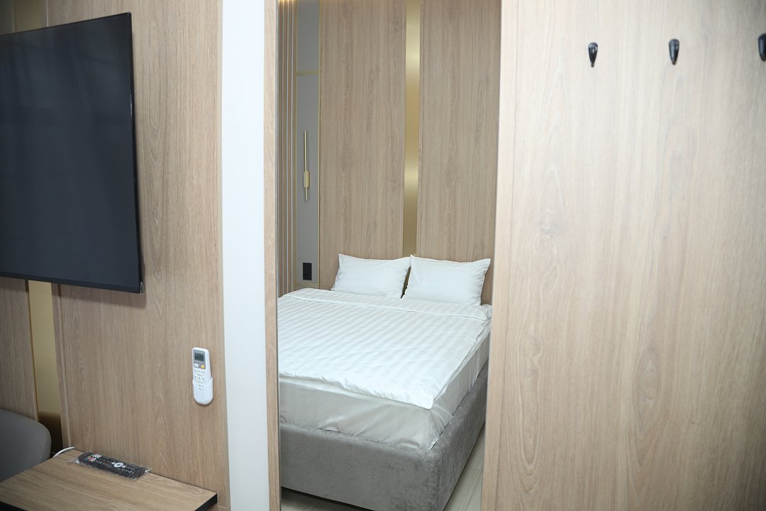 Номер в гостинице общей площадью не менее 18 м², состоящий из одной большой комнаты с двуспальной кроватью размером 180×200, рабочее место (стол), приборы для приготовления чая или кофе, электрический чайник.