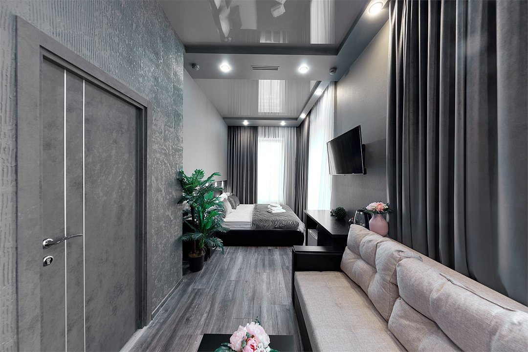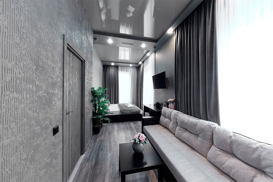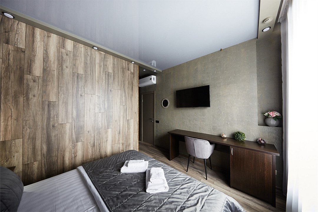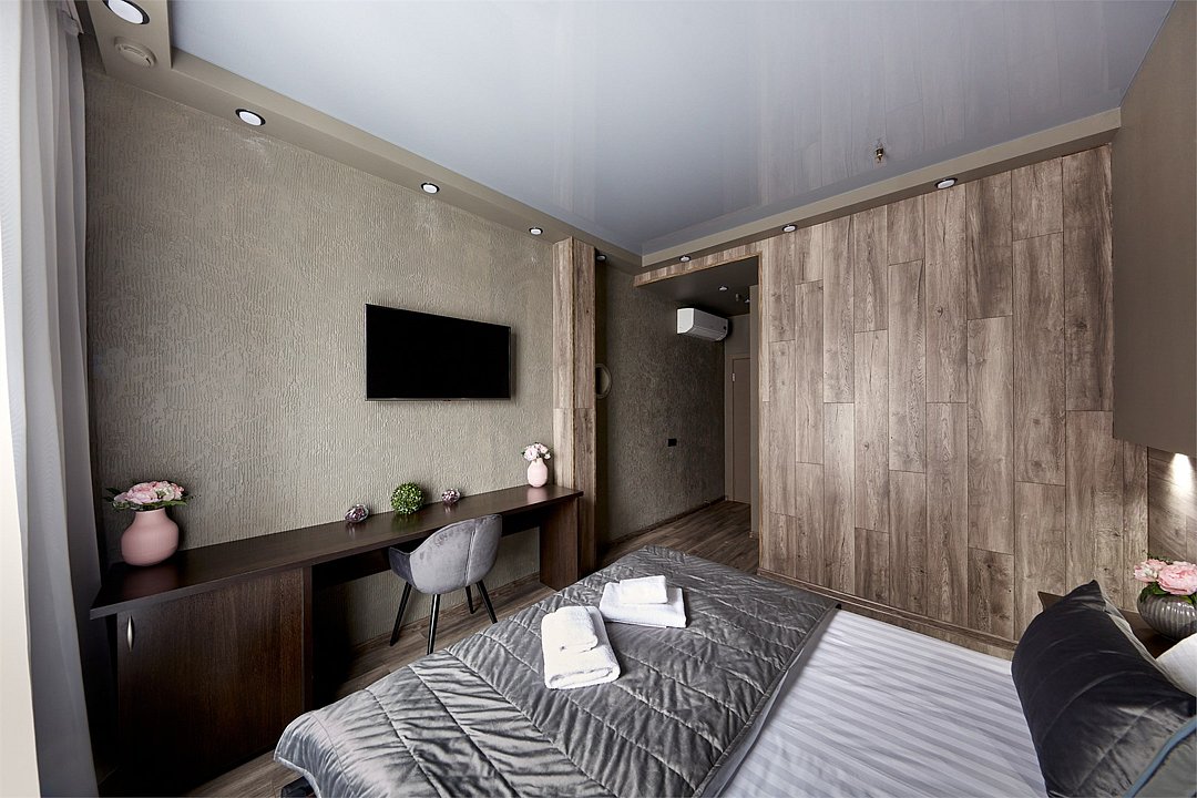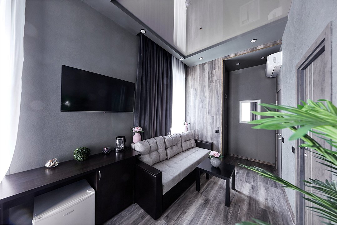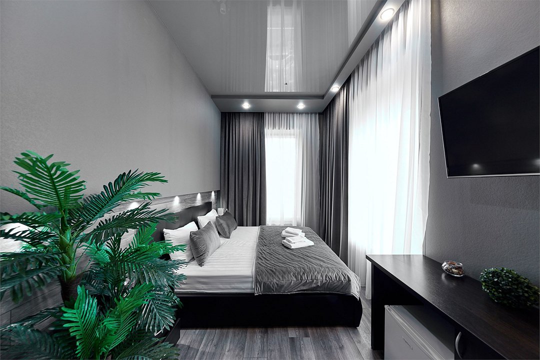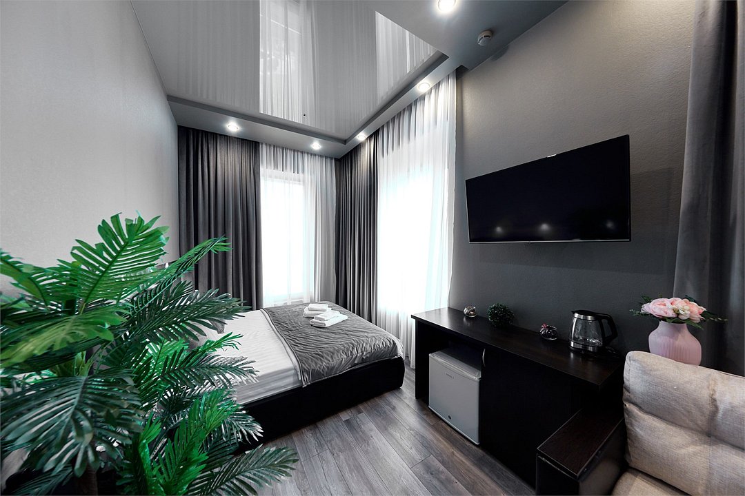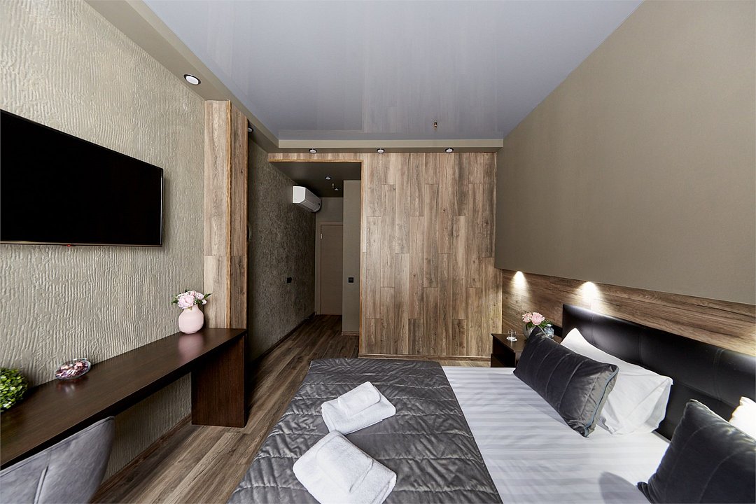 Просторный номер с панорамным окном и двухспальной кроватью. В номере есть раскладывающийся диван. Возможно размещение дополнительного спального места. В номере есть холодильник, прикроватные тумбочки, телевизор со Smart TV, кресло и столик. Есть кондиционер и москитные сетки на окнах. В ванной комнате душевая кабина, есть фен и зеркало с подсветкой. Гости могут воспользоваться общей кухнейУслуги и удобства