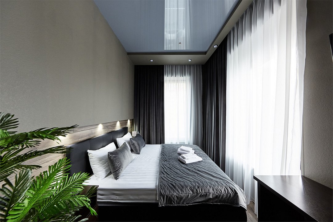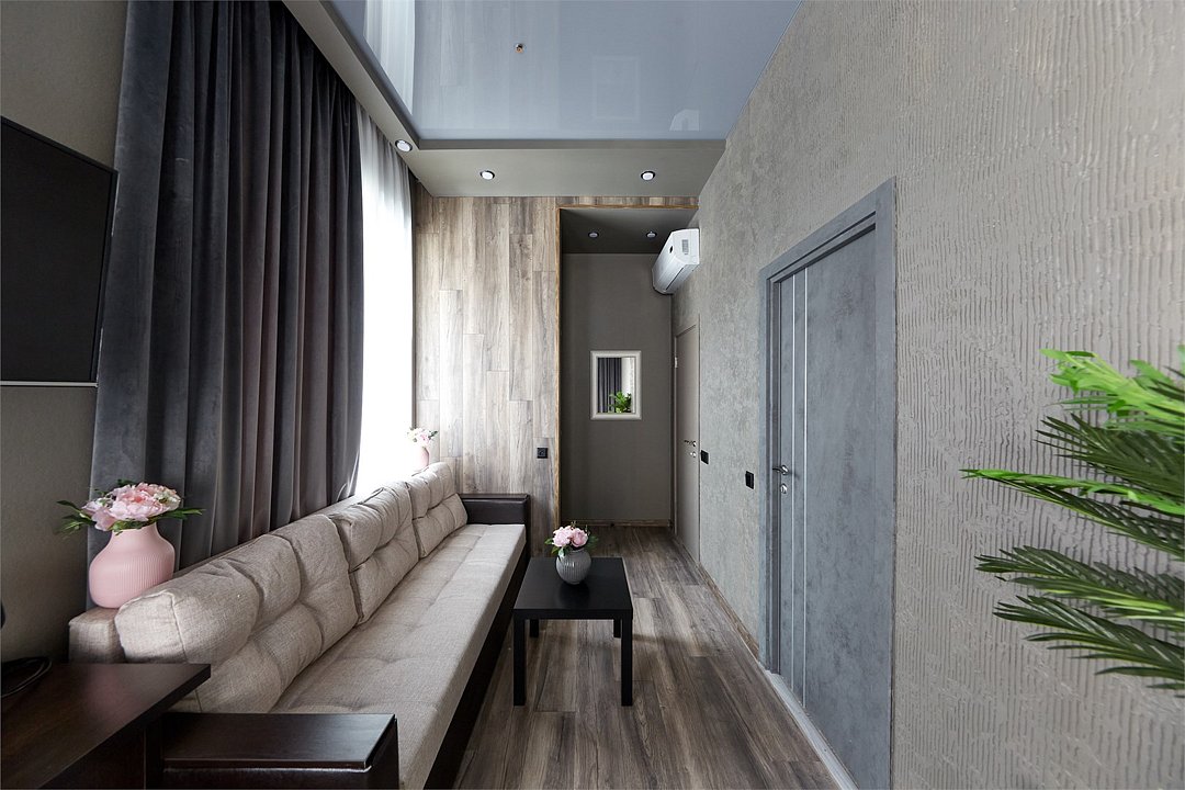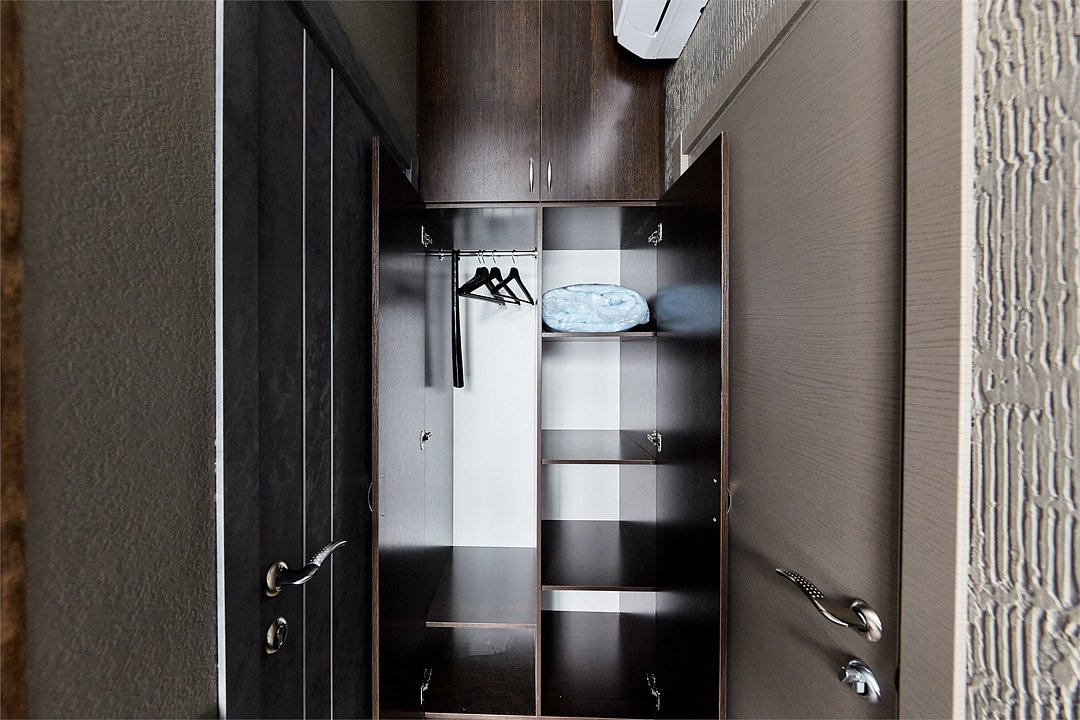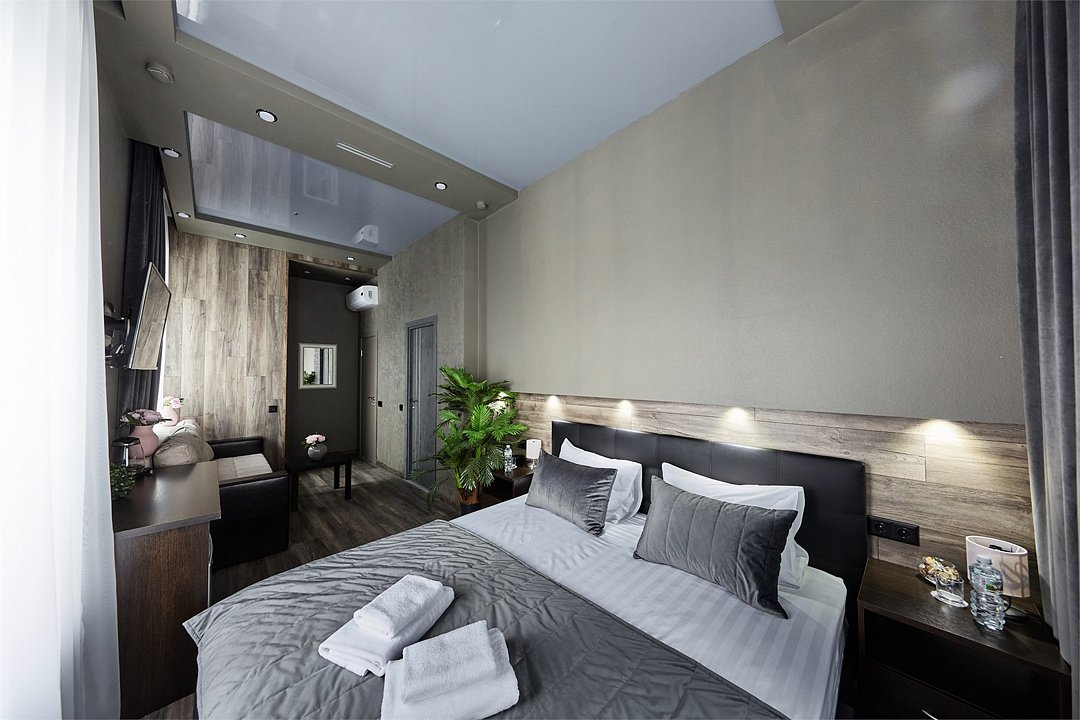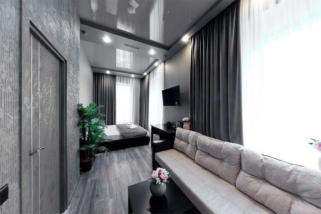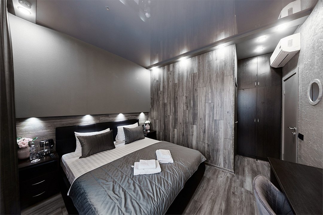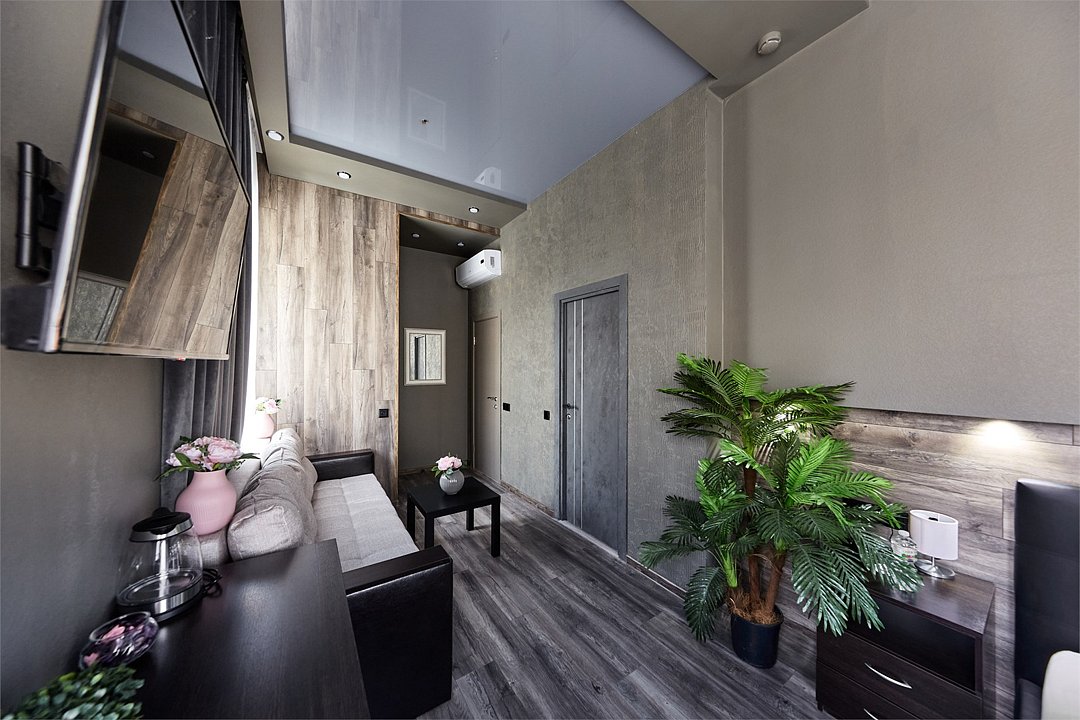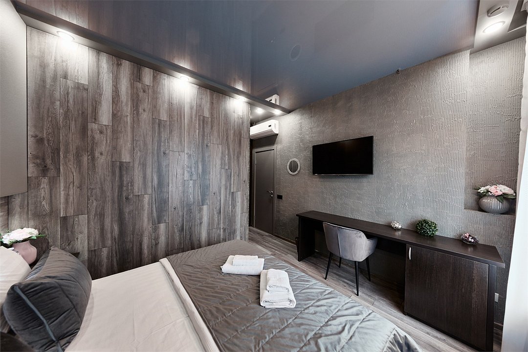 Просторный номер с панорамным окном и двухспальной кроватью. В номере есть раскладывающийся диван. Возможно размещение дополнительного спального места. В номере есть холодильник, прикроватные тумбочки, телевизор со Smart TV, кресло и столик. Есть кондиционер и москитные сетки на окнах. В ванной комнате душевая кабина, есть фен и зеркало с подсветкой. Гости могут воспользоваться общей кухнейУслуги и удобства