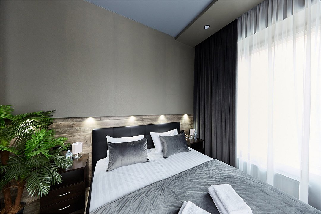 кабельное телевидение, Wi-Fi, кондиционер, светильник, фен, система безопасности, утюг, душевая кабина, санузел, халаты, банные полотенца, тапочки, гигиенические средства, кровать «King size», гипоаллергенное белье, гладильная доска, тумбы, шкаф для одежды, зеркало, звуконепроницаемые стены и окна, обслуживание номеров, чайник, раковина, отопление, вид на город, кресло, вид во двор, ламинат, высокие потолки, кухонная посуда, стаканы, стол, туалетные средства, мини-холодильник, москитная сетка, телевизор со Smart TV, номер для некурящих, бутилированная вода, затемняющая штораВ номере