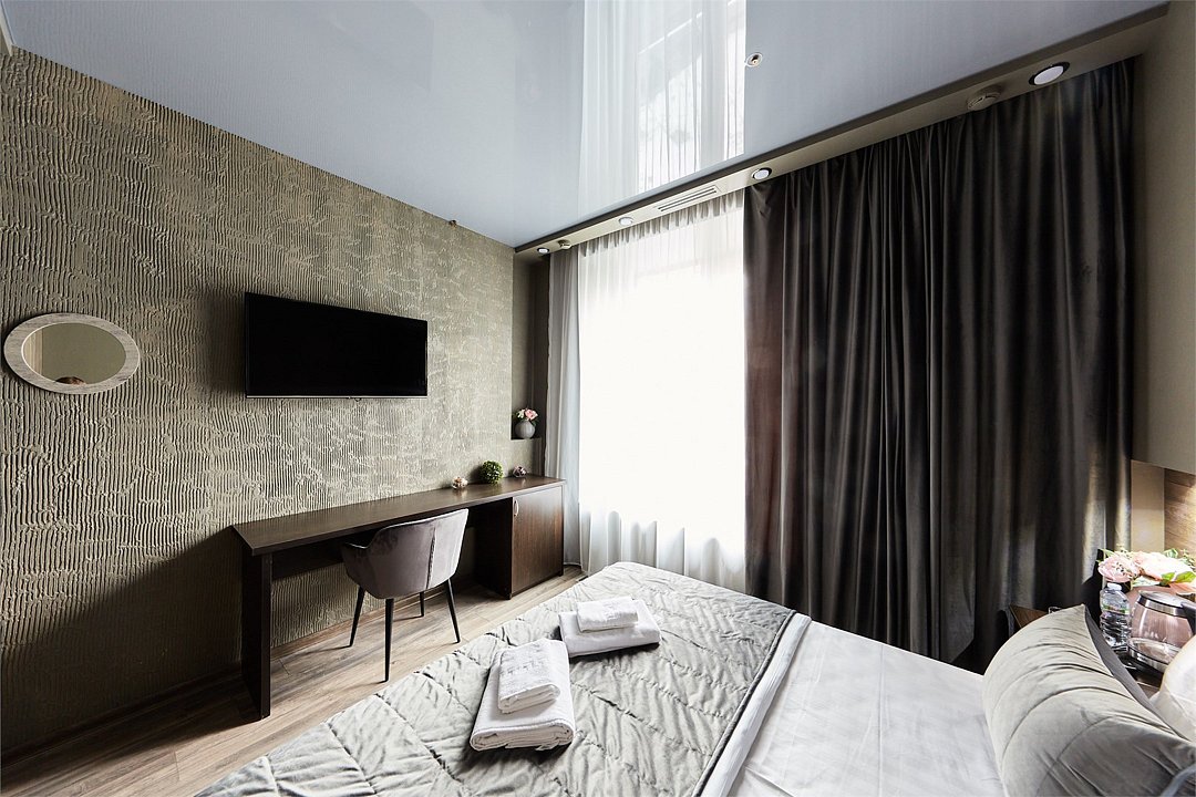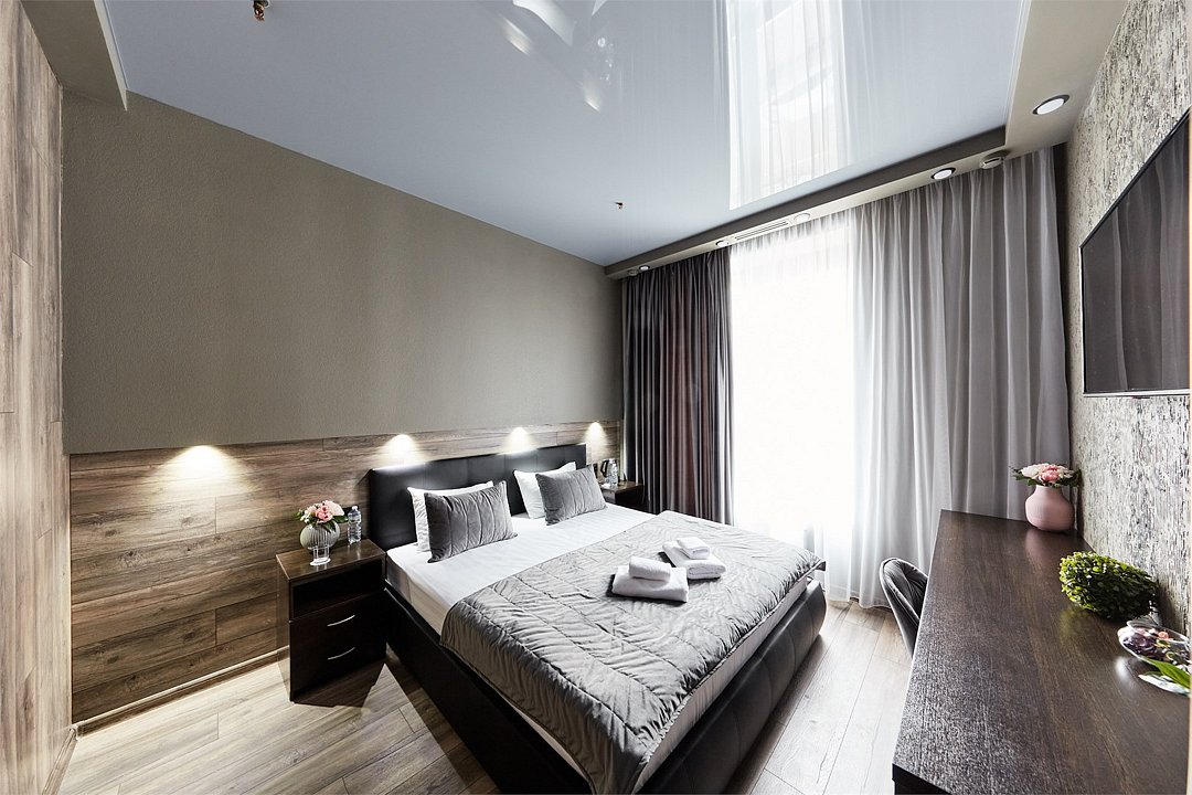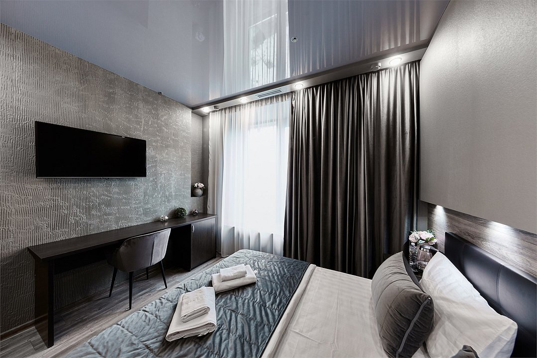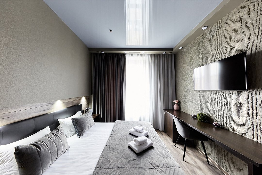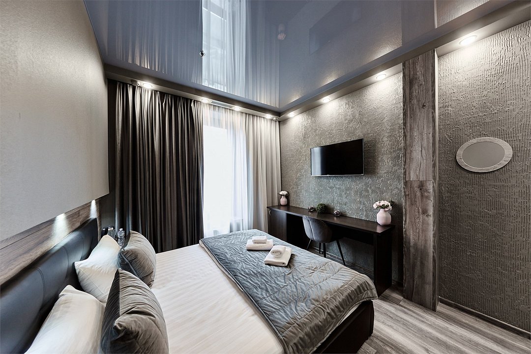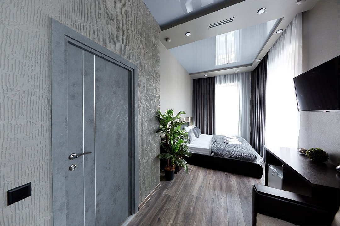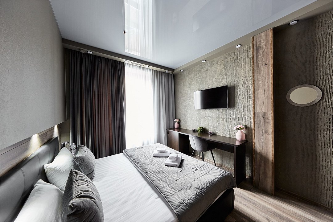 Wi-Fi, кондиционер, светильник, фен, утюг, душевая кабина, санузел, биде, теплый пол, халаты, банные полотенца, тапочки, гигиенические средства, сауна, кровать «King size», гладильная доска, шкаф для одежды, зеркало, обслуживание номеров, чайник, косметическое зеркало, отопление, вид на город, кресло, ламинат, высокие потолки, кухонная посуда, туалетные средства, панорамные окна, диван-кровать, раскладной диван, телевизор с плоским экраном, мини-холодильник, телевизор со Smart TV, номер для некурящих, рабочий стол, уборка номера, услуги прачечной (платно), бутилированная вода, СПА, затемняющая штораВ номере