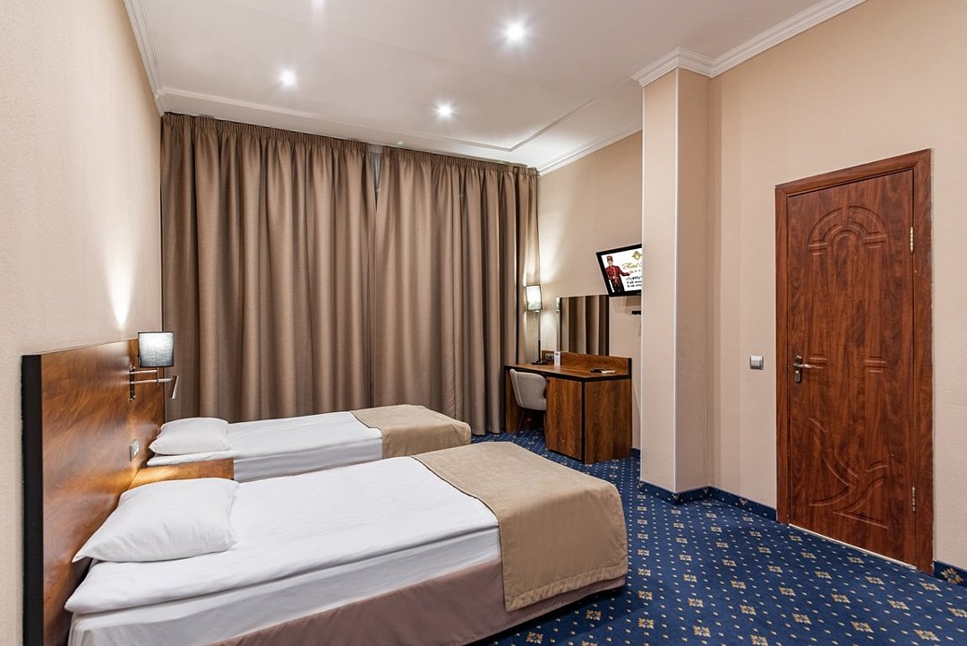 Площадь от 20 кв. м Экономный вариант для размещения 2 человек. В номере две односпальные кровати. Номера категории стандарт "твин" могут незначительно отличаться друг от друга, площадь номера от 20 до 27 м². В номере: рабочая зона, кондиционер, ТВ, полотенце, Wi-Fi, душ, ванна, холодильник (мини-бар). В комплектацию номера включен индивидуальный гигиенический набор.Услуги и удобства