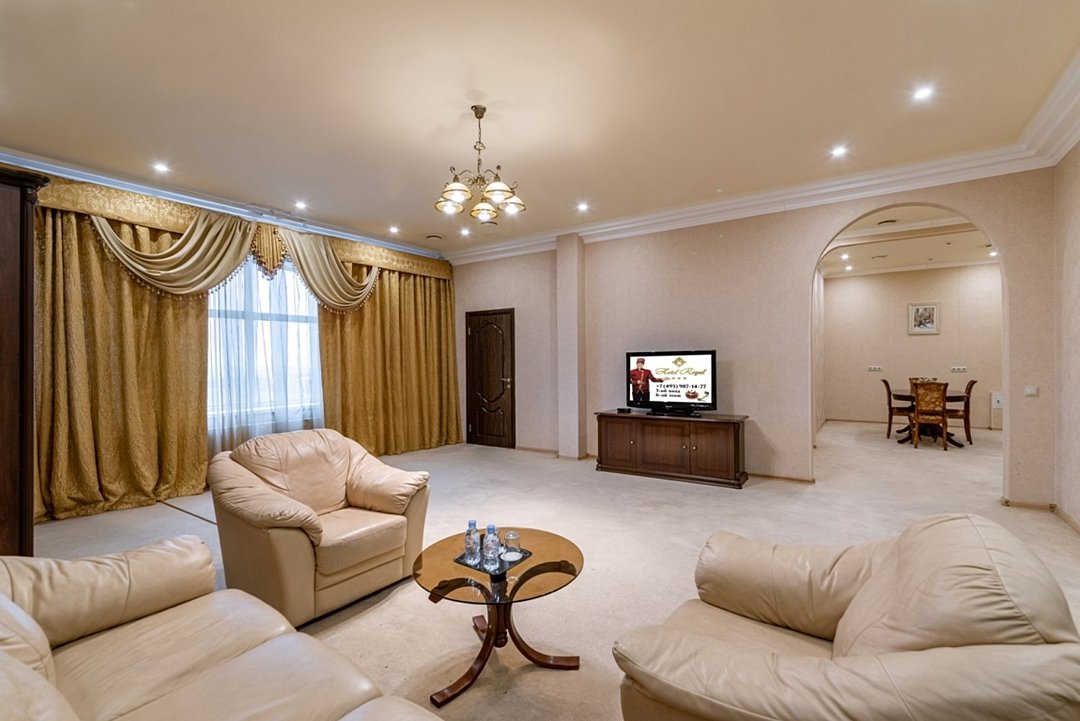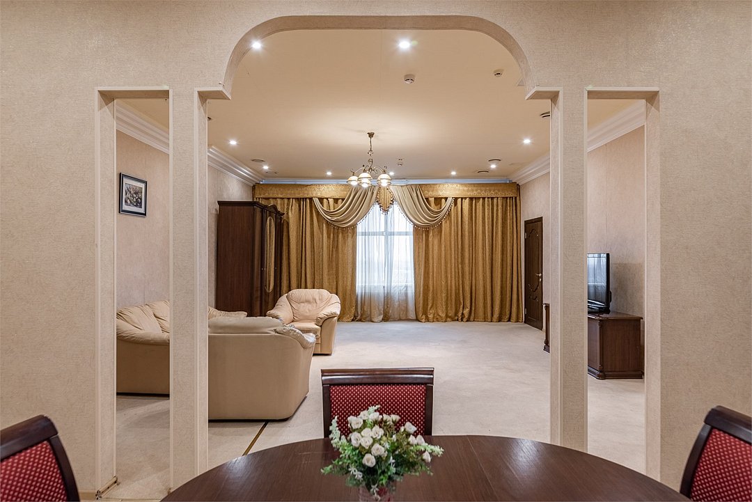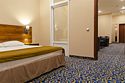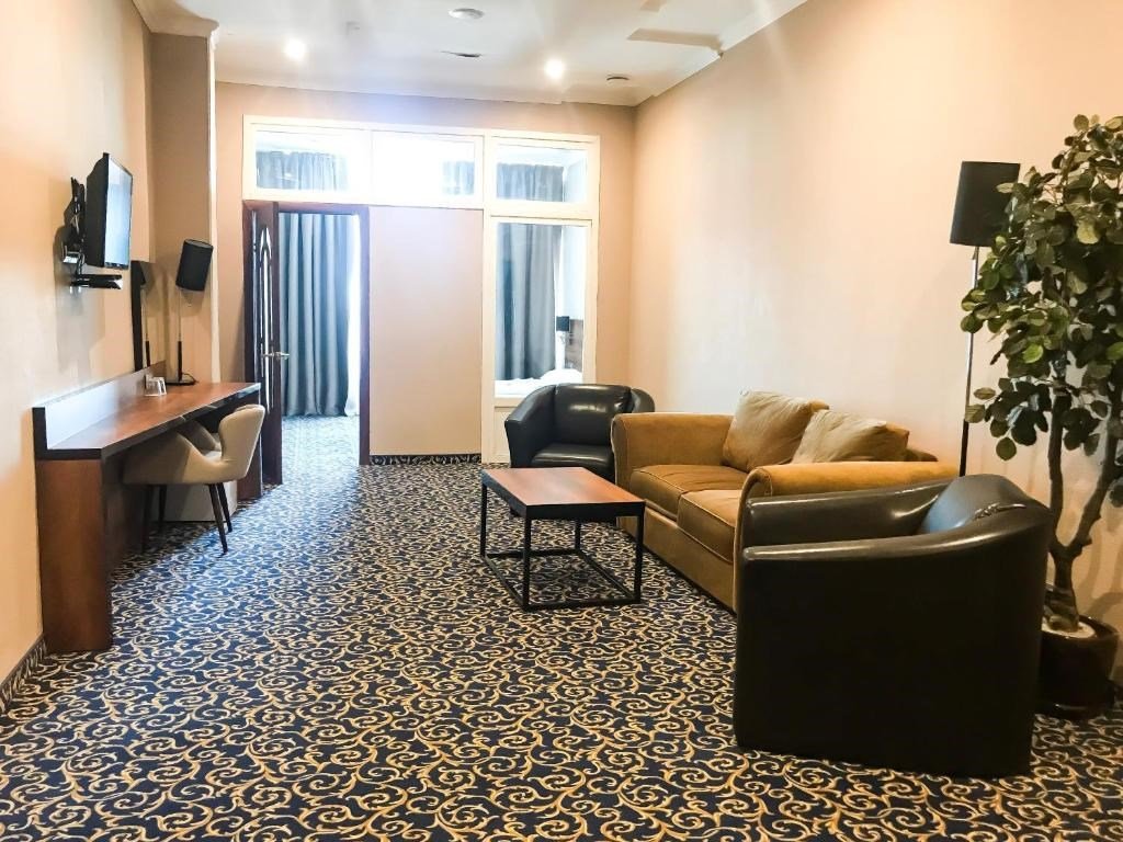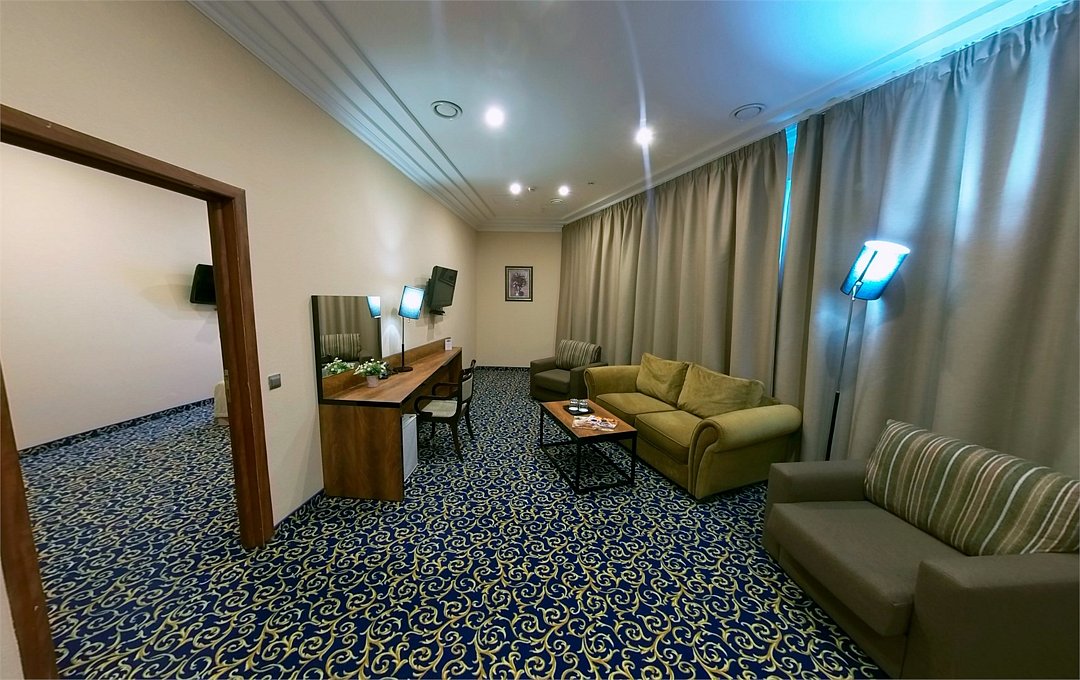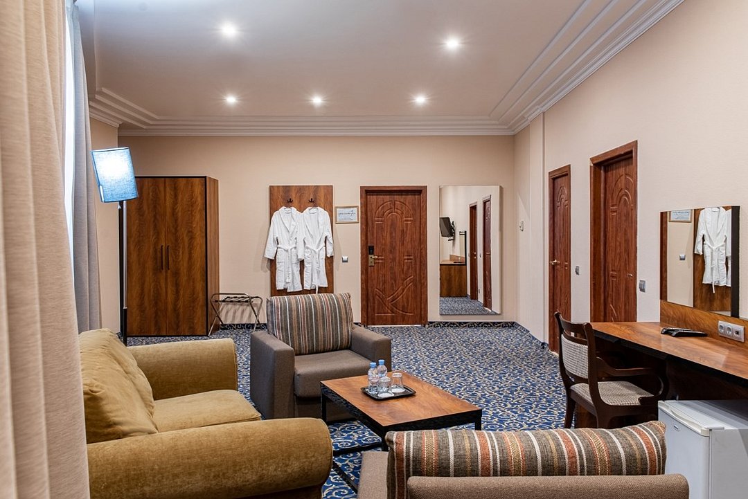 Площадь номера - 36 кв.м. Двухкомнатный номер с одной большой двуспальной кроватью. В номере - кондиционер, спутниковое телевидение, полотенце, тапочки, Wi-Fi, душ, ванна, туалетные принадлежности, холодильник, фен, шкаф/гардероб, гостиная, диван, журнальный столик, зеркало.Услуги и удобства