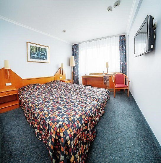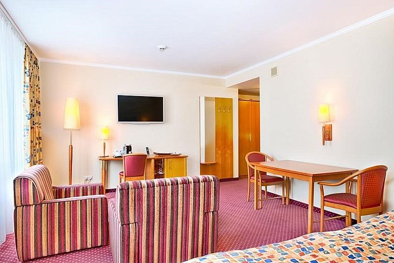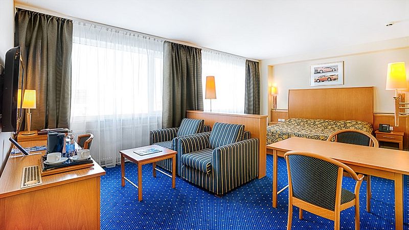 В номере: односпальная кровать, стол, стулья, шкаф, прикроватные тумбочки, письменный стол, телефон, зеркало, тумбочка, телевизор, Wi-Fi, мини-бар.