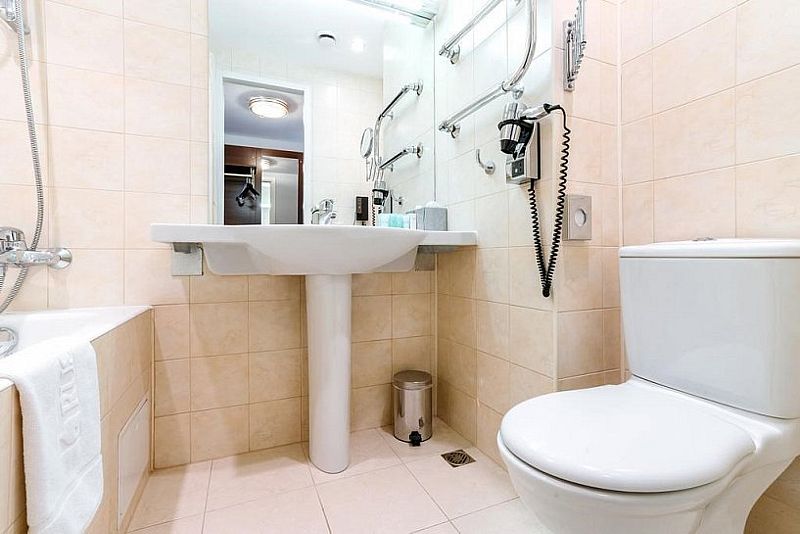 В ванной: туалет, раковина, душ, фен, зеркало.