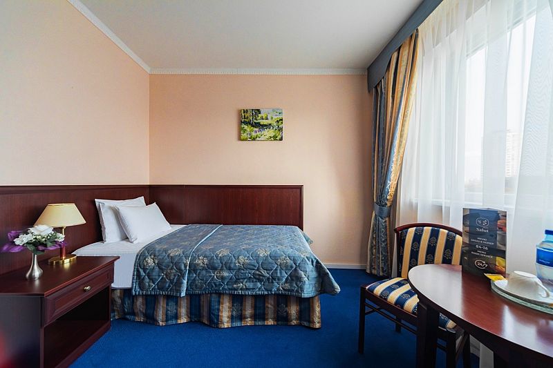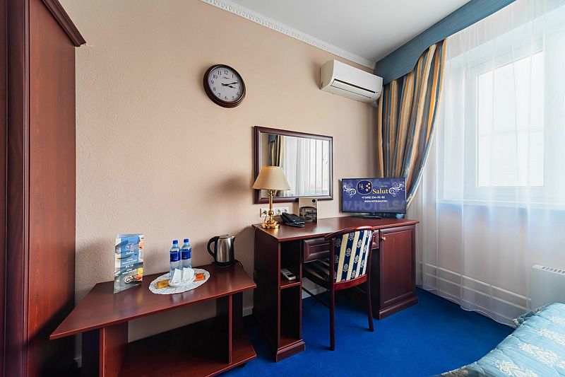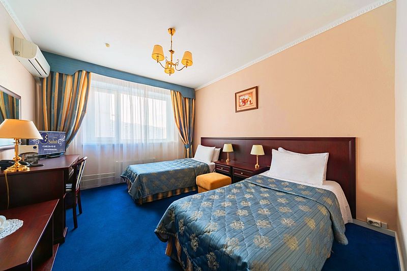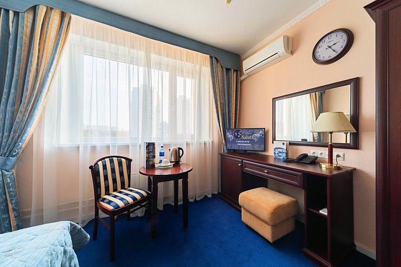 Номера категории «Делюкс» в отеле Салют – идеальный выбор для гостей, привыкших к повышенному комфорту. Классический интерьер и оборудование современного стиля создают уникальную атмосферу. А вид на окрестности с высоты 15 этажа не оставит Вас равнодушными.