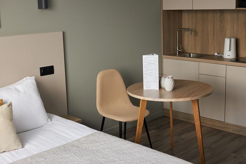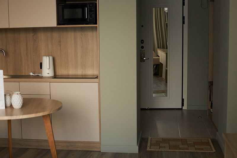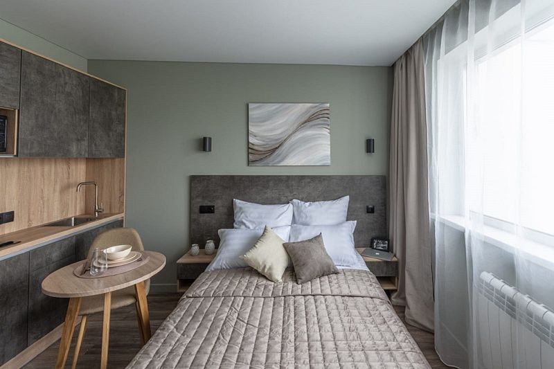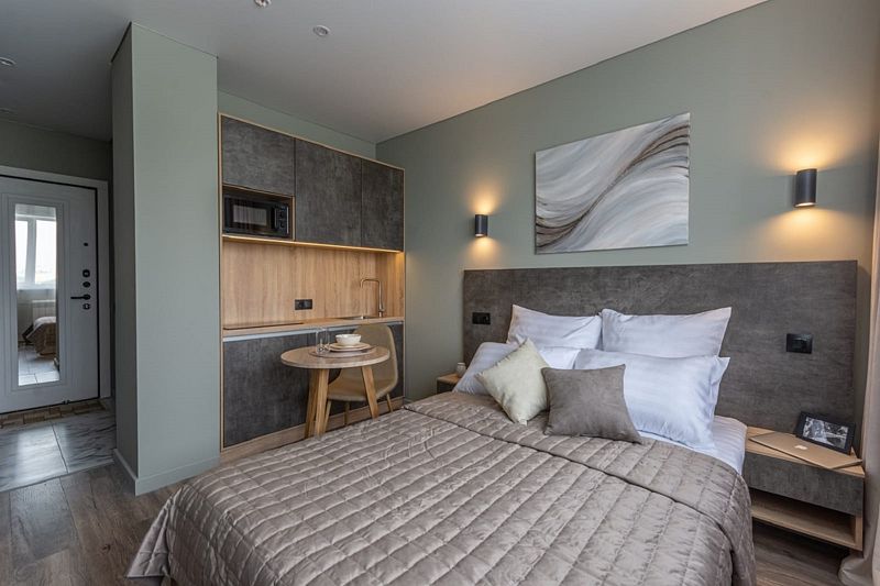 Однокомнатные апартаменты, площадью 17 м² с полутороспальной кроватью, кухонной и обеденной зоной, ванной комнатой.