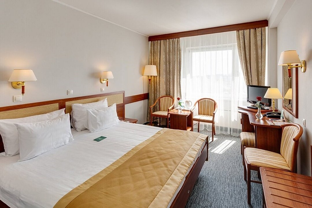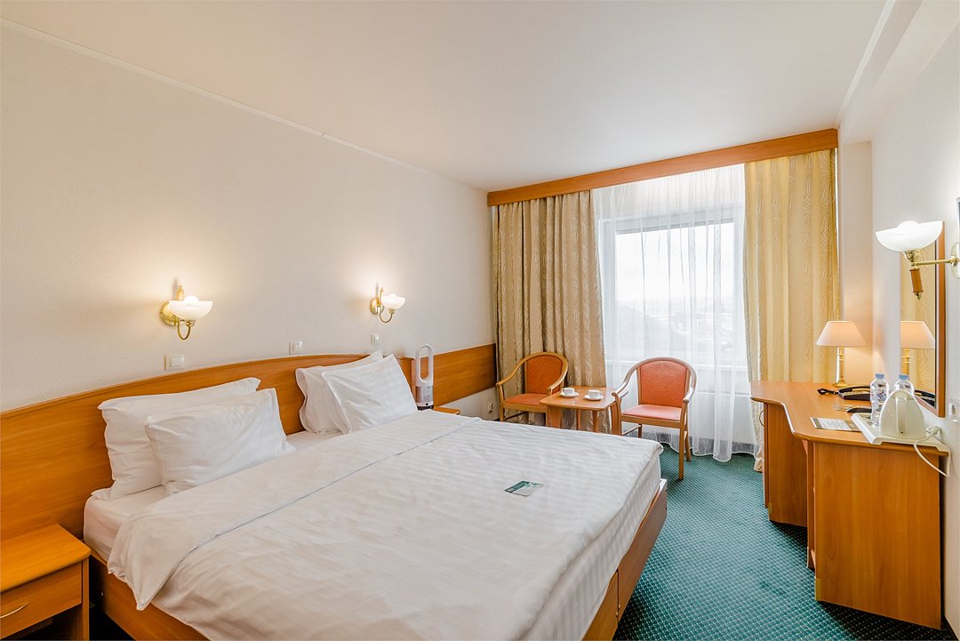 Уютный однокомнатный номер, состоящий из небольшой прихожей и спальной комнаты. В номере удобная современная мебель, широкая кровать (160*200), а так же организованное рабочее пространство с письменным столом. Подходит для размещения 1-2 человек. Смена полотенец, постельного белья ежедневно. *Внешний вид номеров может отличаться от фотографий, представленных на сайте. К Вашим услугам: - Кондиционирование воздуха осуществляется с 15 мая по 15 сентября - Гладильная доска на этаже - Кулер на этаже - Фен - Посещение Фитнес центра - Детская кроватка детям до 3 летУслуги и удобства