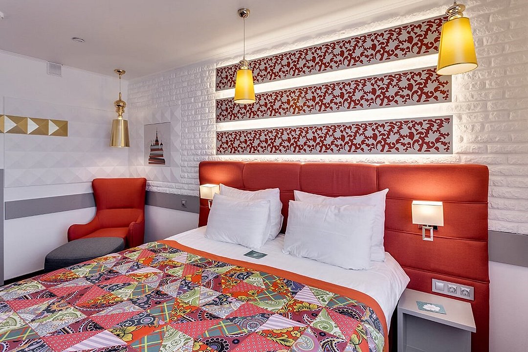 Новые дизайнерские номера первой категории с двуспальной кроватью, расположенные на самом высоком жилом этаже отеля, откуда открывается вид на город с высоты птичьего полета. Шесть из номеров «Арт» предусмотрены для одноместного размещения. В дизайне номеров, коридоров и лифтовых холлов применены технические решения для энергосбережения: свет включается по сигналам датчиков движения, навигация по коридорам продублирована направлением светильников для удобства гостей. Одна большая кровать 180 х 200. Проживание ребёнка на месте родителей до 7 лет - бесплатно. Расположение: 10, 21 и 28 этаж. К Вашим услугам: • 1 двуспальная кровать (180х200 см) или 1 односпальная кровать (120х200см) • LCD-телевизор с функцией Smart-TV • Устройство для зарядки гаджетов с функцией воспроизведения музыки • Яндекс Станция – умная колонка с Алисой • Косметика в ванной комнате бренда Aroma Garden • Чайная станция (чай черный и зеленый, кофе пакетированный, сахар, размешиватель) • Вода питьевая негазированная • Халаты и тапочки в номере • Бесплатный беспроводной интернет Wi-Fi • Бесплатное посещение фитнес-центра • Бесплатная чистка обуви • Услуги прачечной по запросу • Заказ еды и напитков в номер по меню "Рум-сервис" круглосуточно • Кулер с горячей и холодной водой на этаже • Прачечная самообслуживания на этаже (машины для стирки и сушки вещей, капсулы для стирки, гладильные принадлежности)Услуги и удобства