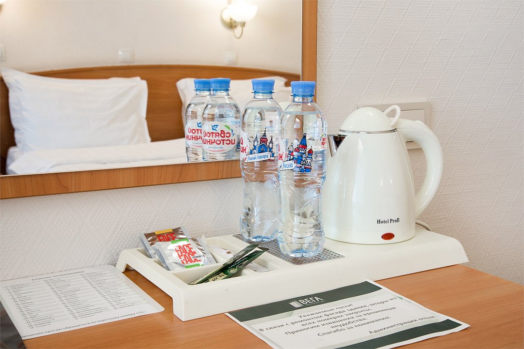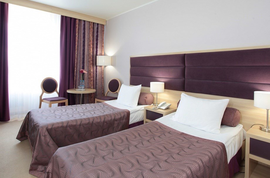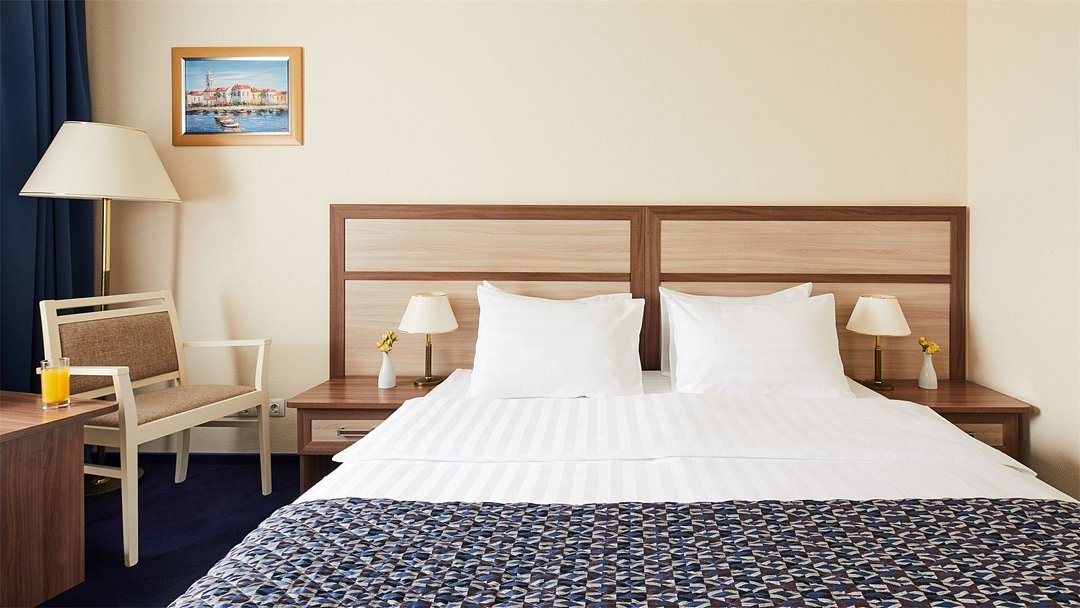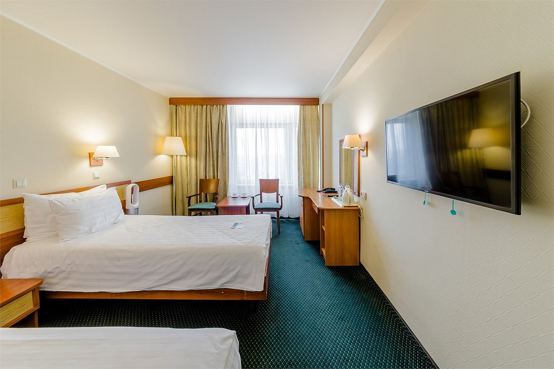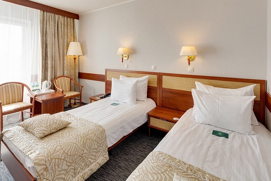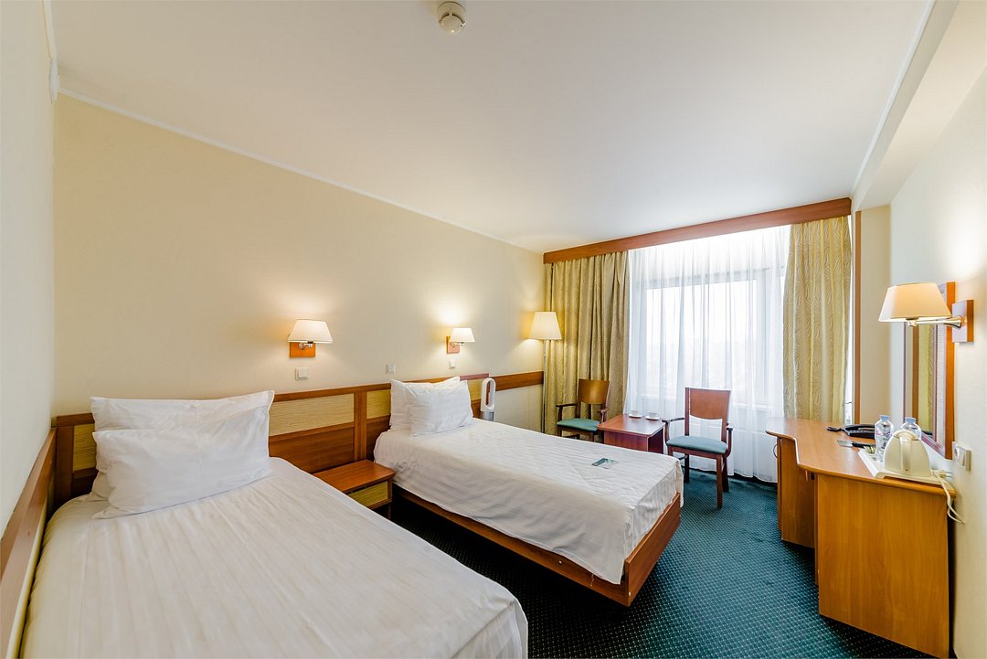 Комфортабельный реновированный однокомнатный номер с современным дизайном, состоящий из прихожей и спальной комнаты. В номере удобная современная мебель, 2 кровати (90*200), а так же организованное рабочее пространство с письменным столом. Подходит для размещения 1-2 человек. Гостям предоставляется меню подушек, бутилированная минеральная вода при заезде, гладильная комната на каждом этаже. Смена полотенец, постельного белья ежедневно.Услуги и удобства