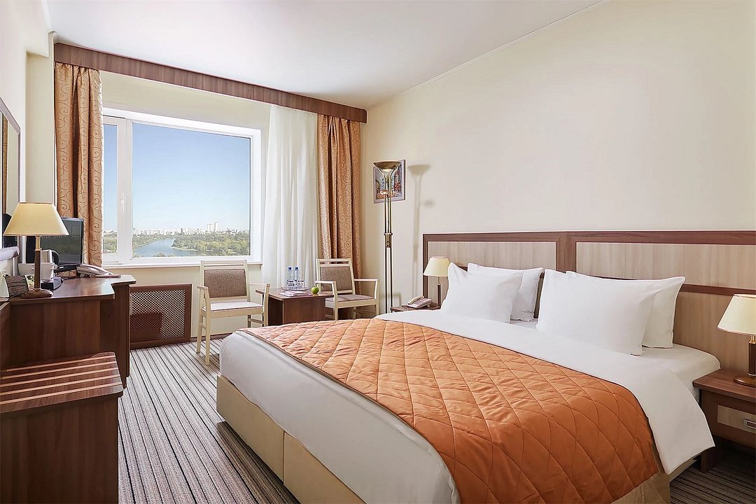 кабельное телевидение, Wi-Fi, кондиционер, светильник, настольные лампы, фен, электронные замки, утюг, ванная комната, ванна, санузел, халаты, банные полотенца, тапочки, кровать «King size», стулья, шкаф для одежды, вешалки, журнальный столик, зеркало, раковина, вид на город, кулер на этаже, стол, туалет, внутренний телефон, телевизор с плоским экраном, мини-холодильник, гостиничная парфюмерия, вид на озероВ номере