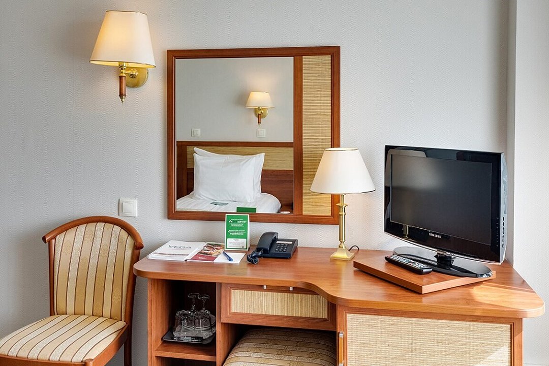 Комфортабельный реновированный однокомнатный номер с современным дизайном, состоящий из прихожей и спальной комнаты. В номере удобная современная мебель, широкая кровать (160*200), а так же организованное рабочее пространство с письменным столом. Подходит для размещения 1-2 человек. Гостям предоставляется меню подушек, бутилированная минеральная вода при заезде, гладильная комната на каждом этаже. Смена полотенец, постельного белья ежедневно.Услуги и удобства
