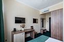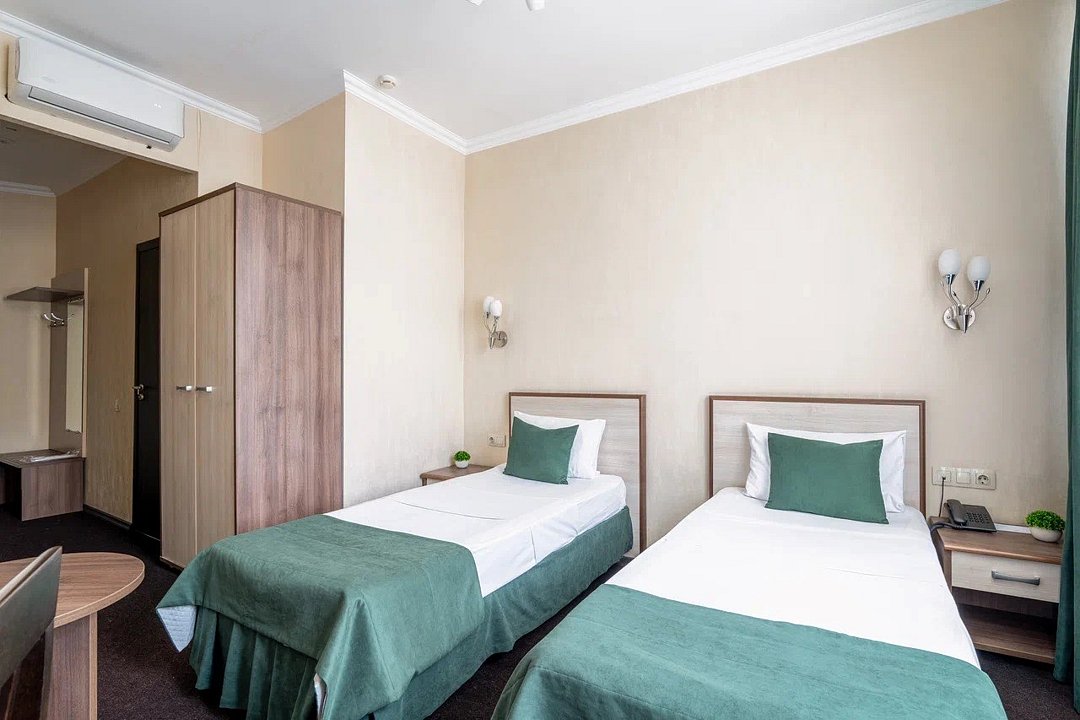 телевизор, Wi-Fi, интернет, холодильник, кондиционер, фен, утюг, ванная комната, банные принадлежности, банные полотенца, тапочки, две односпальные кровати, стулья, письменный стол, зеркало, унитаз, душ, вид на город, туалет, сплит-система, мини-холодильник, шапочка для душаВ гостиничном номере