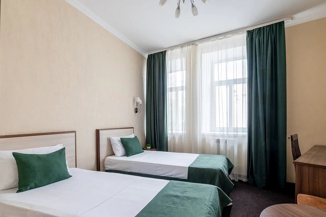 кабельное телевидение, Wi-Fi, светильник, фен, система безопасности, электронные замки, банные принадлежности, банные полотенца, тапочки, две односпальные кровати, тумбы, стулья, шкаф для одежды, вешалки, журнальный столик, багажная тумба, зеркало, унитаз, раковина, ковровое покрытие, отопление, душ, вид на город, кулер на этаже, вид во двор, туалетные средства, туалет, внутренний телефон, телевизор с плоским экраном, рабочий столВ гостиничном номере