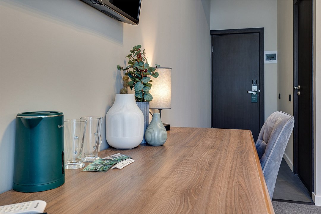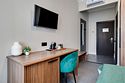 телевизор, Wi-Fi, интернет, кондиционер, фен, утюг, ванная комната, душевая кабина, санузел, кровать «Queen size», вешалки, письменный стол, зеркало, чайный набор, чайник, унитаз, раковина, душ, вид на город, туалет, сплит-система, мини-холодильник, рабочий стол, затемняющая штора, зеркало в полный ростВ гостиничном номере