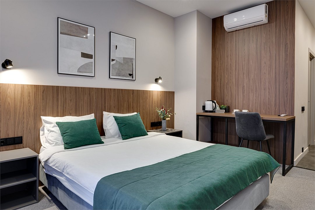 телевизор, Wi-Fi, IP-телефон, электронные замки, ванная комната, санузел, халаты, банные полотенца, тапочки, гигиенические средства, косметические средства, кровать «King size», тумбы, вешалки, письменный стол, зеркало, сейф, унитаз, раковина, душ, вид на город, кулер на этаже, стул, туалетные средства, сплит-система, раскладное кресло, телевизор с плоским экраном, мини-холодильник, гигиенический душ, кресло-кровать, услуги прачечной (платно), шапочка для душа, мылоВ гостиничном номере