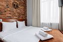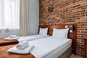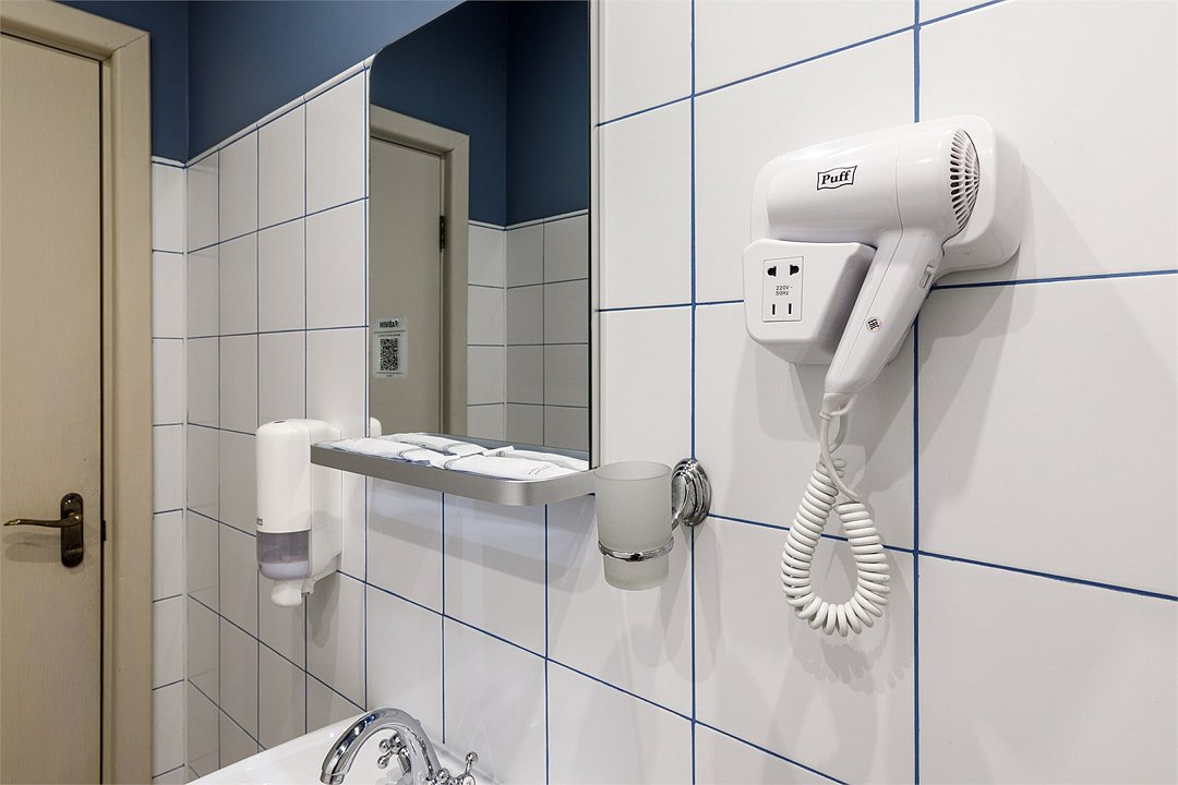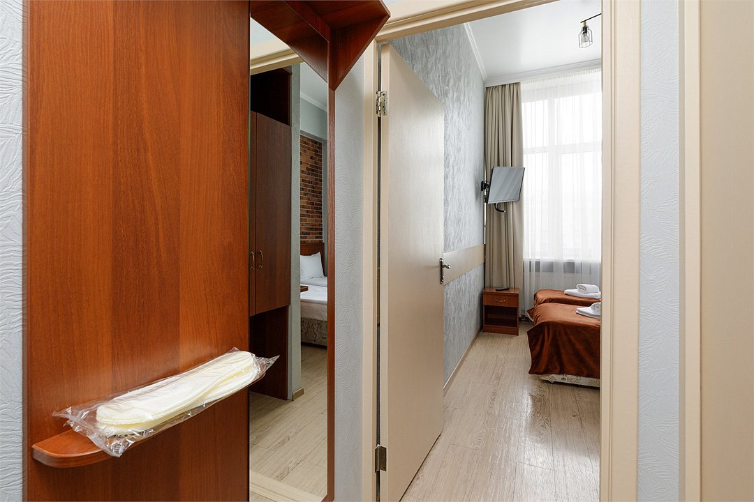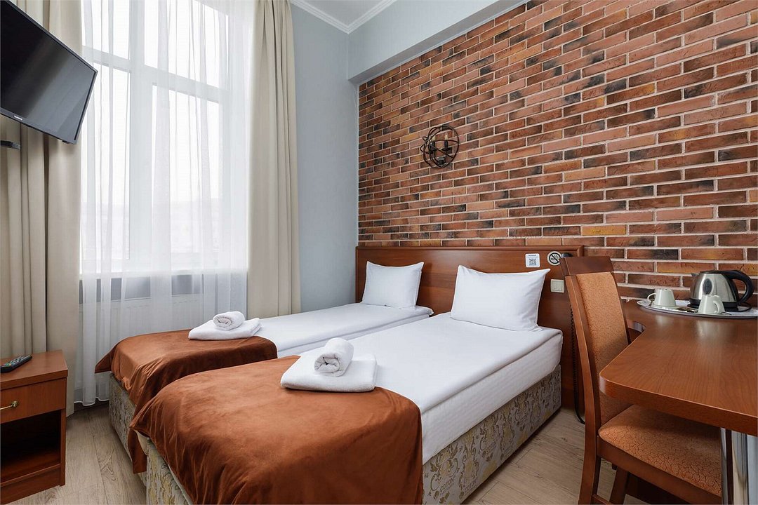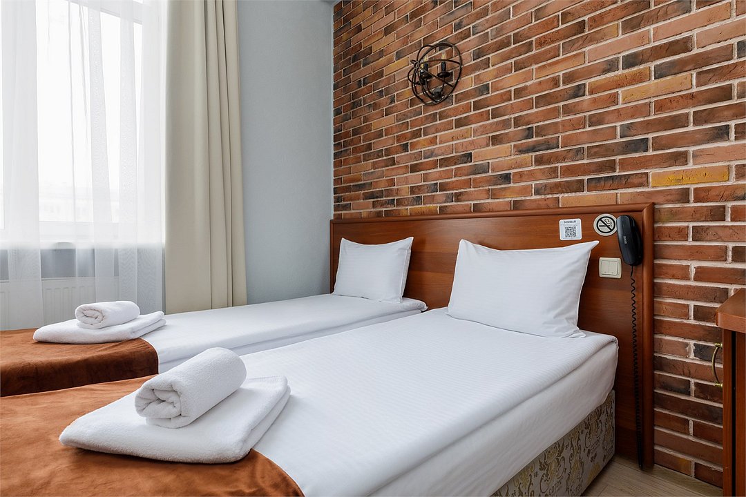 Стандартный номер с 2 кроватями в мягких спокойных тонах предлагает необходимый комфорт для гостей, которым нужны отдельные кровати. В номере: кондиционер, сейф, бесплатный WI-FI, телевизор с плоским экраном, электрочайник, мини-холодильник, набор посуды и чайный набор. Для связи с ресепшн имеется телефон. Две односпальные кровати с удобным матрасом и мягким пастельным бельем, тапочки и полотенца, прикроватное освещение и плотные ролл-шторы на окне. В ванной комнате душевая кабина, туалетно-косметические принадлежности и фен. Номера с видом на Ленинградский проспект.Услуги и удобства