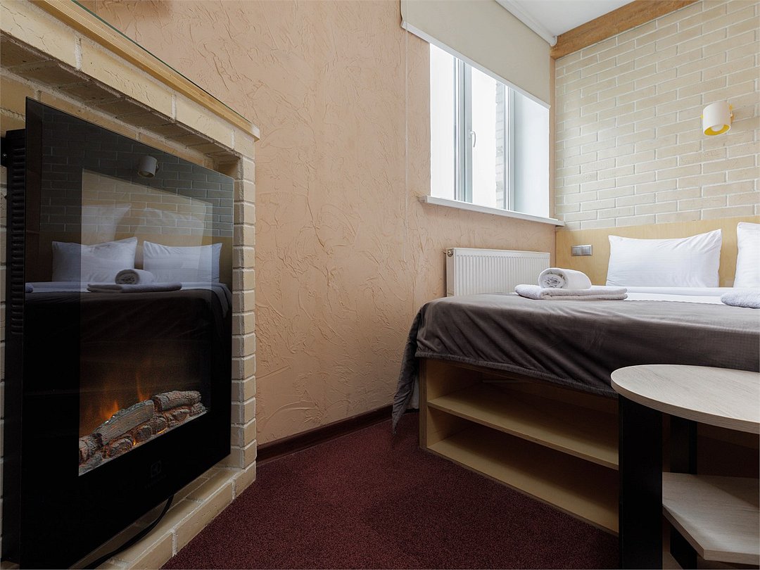 Стильный номер с камином для любителей современного дизайна с элементом домашнего тепла и уюта. В организации пространства прослеживаются прямые линии и лаконичность. К услугам гостей удобная двуспальная кровать, мягкое пастельное белье, тапочки и полотенца, прикроватное освещение, плотные ролл-шторы и большой раскладывающийся диван.. В номере есть камин, кондиционер, сейф, бесплатный WI-FI, телевизор с плоским экраном, электрочайник, мини-холодильник, набор посуды, чайный набор и ваза для цветов. Для связи с ресепшн имеется телефон. Максимальная вместимость номера 4 взрослых гостя. Возможно также Бесплатное размещение 2-х детей до 7 лет без предоставления дополнительного места. Ванная комната с душем оснащена туалетно-косметическими принадлежностями и феном. Приглашаем Вас сделать свой выбор в пользу этого номера, где Вы сможете погреться у камина, провести незабываемый вечер и наполниться силами для следующего дня.Услуги и удобства