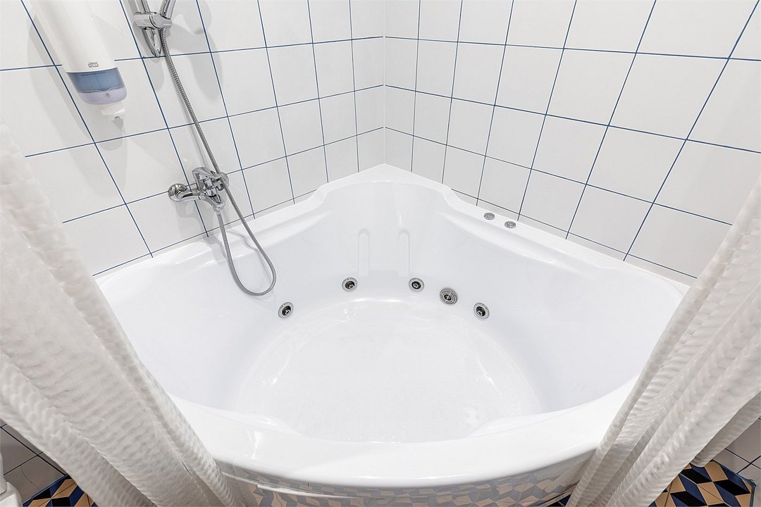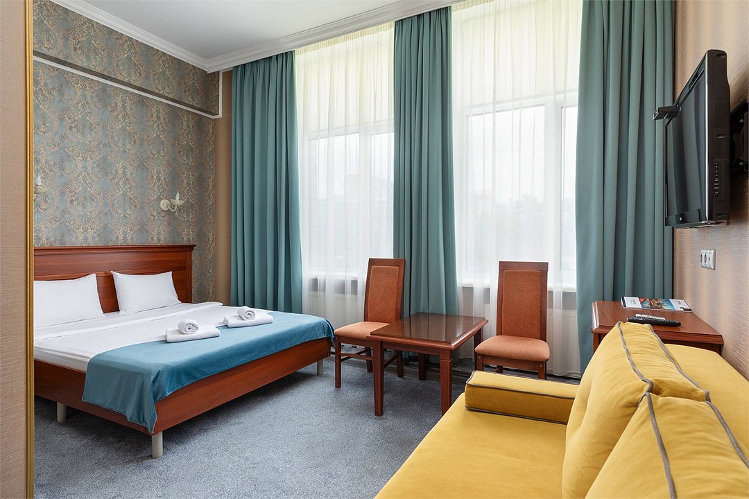 Просторный номер с ванной-джакузи, большим телевизором, гостевой зоной с диваном и прихожей. Дизайн выполнен в классическом стиле, наполнен эстетикой и практичностью в организации пространства. Номер располагает всем необходимым для Вашего комфортного отдыха и работы. К услугам гостей: кондиционер, сейф, бесплатный WI-FI, рабочее пространство, 2 больших зеркала, телевизор с плоским экраном, электрочайник, мини-холодильник, набор посуды, чайный набор и ваза для цветов. Для связи с ресепшн имеется телефон. Двуспальная кровать с удобным матрасом и мягким пастельным бельем, тапочки и полотенца, прикроватное освещение и плотные ролл-шторы. Ванна с джакузи сделает ваш отдых особенным и незабываемым, в дополнение - туалетно-косметические принадлежности и фен. Максимальная вместимость номера до 3 гостей. Дополнительное спальное место на одноместном диване (за доп. плату). Также возможно размещение 1 или 2 детей до 7 лет Бесплатно без предоставления дополнительного места. Персонал отеля всегда на связи, чтобы сделать Ваш отдых максимально комфортным.Услуги и удобства