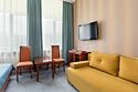 Просторный номер с ванной-джакузи, большим телевизором, гостевой зоной и прихожей. Дизайн выполнен в классическом стиле, наполнен эстетикой и практичностью в организации пространства. Номер располагает всем необходимым для Вашего комфортного отдыха и работы. К услугам гостей: кондиционер, сейф, бесплатный WI-FI, рабочее пространство, зеркало, телевизор с плоским экраном, электрочайник, мини-холодильник, набор посуды, чайный набор и ваза для цветов. Для связи с ресепшн имеется телефон. Двуспальная кровать с удобным матрасом и мягким пастельным бельем, тапочки и полотенца, прикроватное освещение и плотные ролл-шторы. Ванна с джакузи сделает ваш отдых особенным и незабываемым, в дополнение - туалетно-косметические принадлежности и фен. Максимальная вместимость номера 2 взрослых гостя. Также возможно размещение 1 ребенка до 7 лет Бесплатно без предоставления дополнительного места. Персонал отеля всегда на связи, чтобы сделать Ваш отдых максимально комфортным.Услуги и удобства