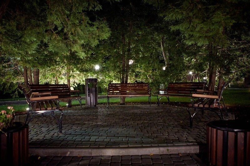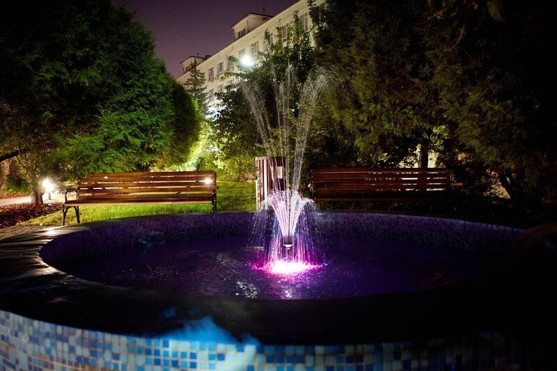 Территория не большая но ухоженная, много зелени и даже есть фонтанчик.