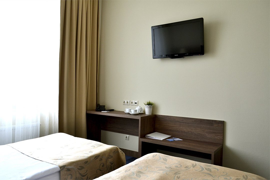 телевизор, кабельное телевидение, Wi-Fi, телефон, кондиционер, настольные лампы, электронные замки, банные полотенца, косметические средства, две односпальные кровати, гипоаллергенное белье, тумбы, шкаф для одежды, вешалки, письменный стол, зеркало, пуфики, обслуживание номеров, унитаз, раковина, душ, кулер на этаже, вид во двор, без вида, можно с питомцами, лежанка, мискаВ номере