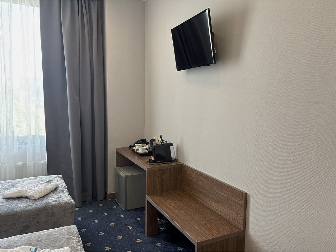 телевизор, кабельное телевидение, Wi-Fi, телефон, кондиционер, настольные лампы, электронные замки, банные полотенца, косметические средства, две односпальные кровати, гипоаллергенное белье, тумбы, шкаф для одежды, вешалки, письменный стол, зеркало, пуфики, обслуживание номеров, унитаз, раковина, душ, кулер на этаже, можно с питомцамиВ гостиничном номере