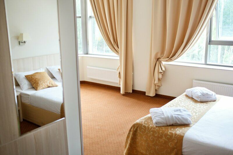 телевизор, кабельное телевидение, Wi-Fi, телефон, кондиционер, настольные лампы, электронные замки, банные полотенца, косметические средства, две односпальные кровати, гипоаллергенное белье, тумбы, шкаф для одежды, вешалки, письменный стол, зеркало, пуфики, обслуживание номеров, унитаз, раковина, душ, кулер на этаже, вид во двор, вид на лес, без вида, можно с питомцами, лежанка, мискаВ номере