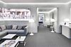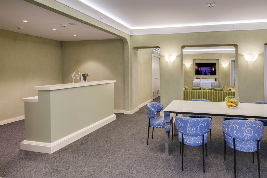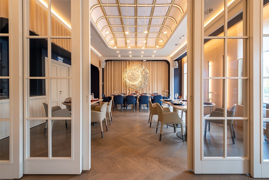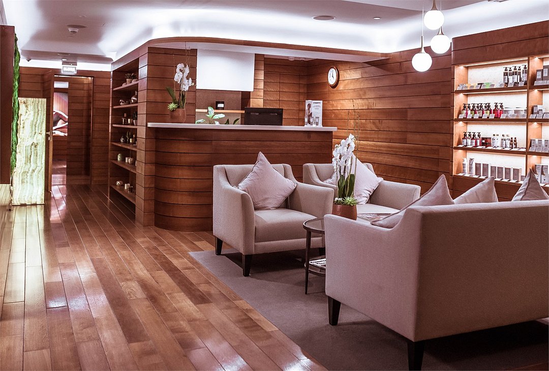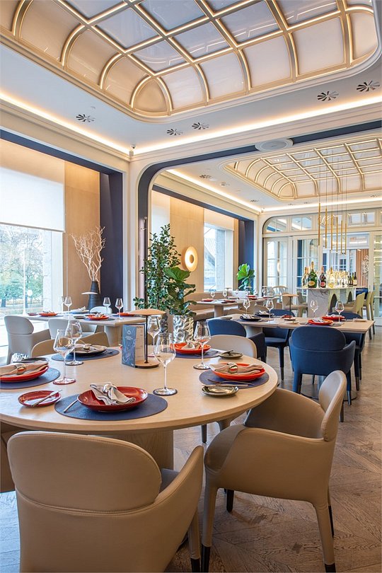 Панорамные окна, заливающие залы светом, пастельные оттенки, дерево и живая зелень создают особую атмосферу тепла.