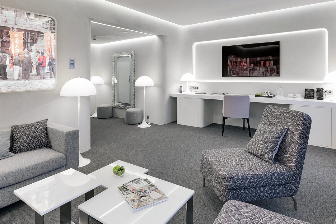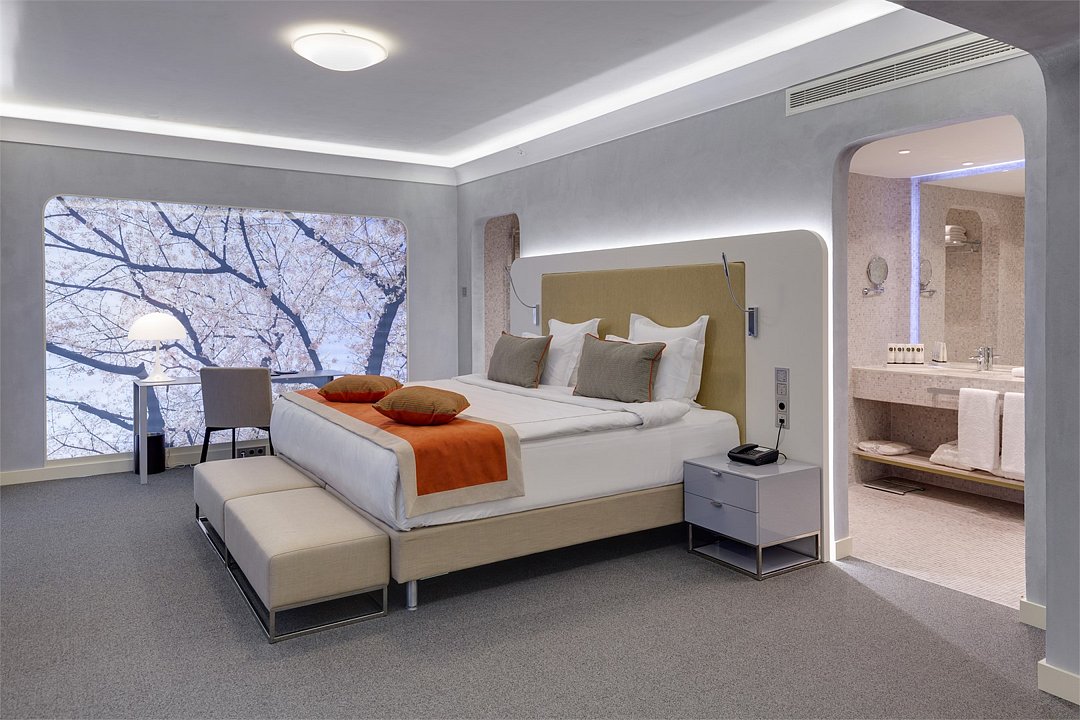 телевизор, спутниковое телевидение, Wi-Fi, IP-телефон, кондиционер, система климат-контроля, светильник, фен, весы, система безопасности, электронные замки, кофемашина, ванная комната, ванна или душевая кабина, биде, банные принадлежности, халаты, тапочки, кровать «King size», шкаф для одежды, вешалки, журнальный столик, письменный стол, багажная тумба, зеркало, эксклюзивная мебель, мини-бар, письменные принадлежности, чайный набор, обслуживание номеров, информационная карта, меню, сейф, унитаз, мягкая мебель, косметическое зеркало, вид на город, центральное кондиционирование, высокие потолки, меню подушек, кофейный столик, стул, туалетные средства, туалет, панорамные окна, мини-холодильник, номер для некурящих, электронный консьерж 24/7, средства индивидуальной защиты, фитнес-зона, туалетные принадлежности премиум-класса, бутилированная вода, можно с питомцамиВ гостиничном номере