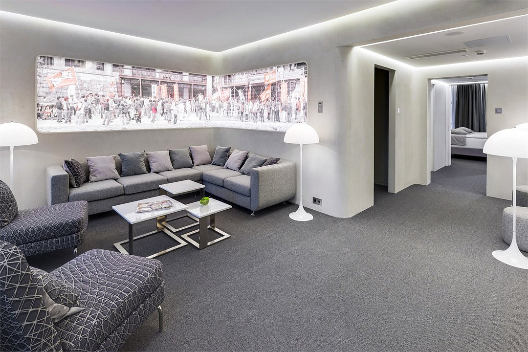 Высокие, до 5 метров, потолки и захватывающий вид на центр столицы подарит гостям ощущение полета.