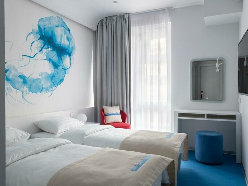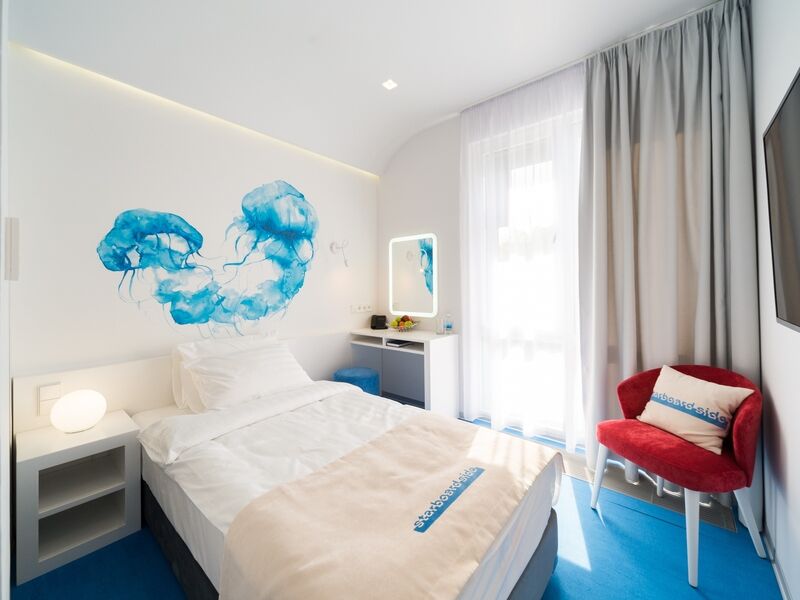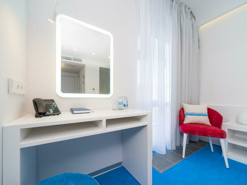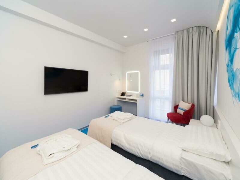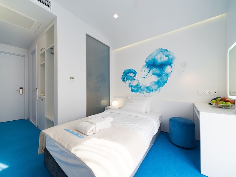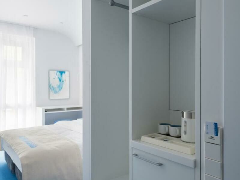 Стильный дизайн, всё выдержано в бело-голубых тонах, много света. Приятно было возвращаться в отель, особенно когда на улице дождь и всё серое, а внутри ярко и светло. Номер уютный и комфортный, всё продумано для удобства гостей.