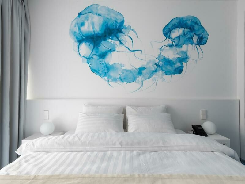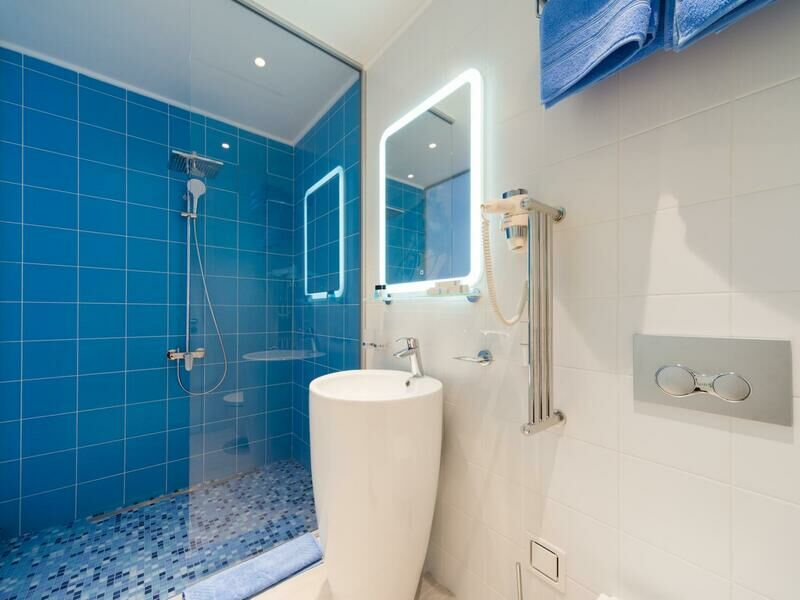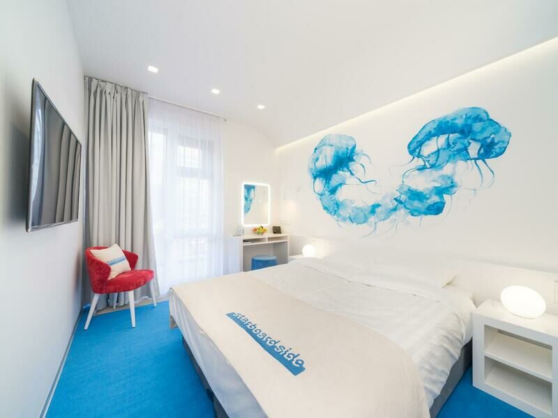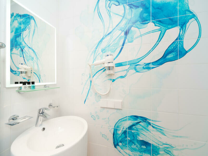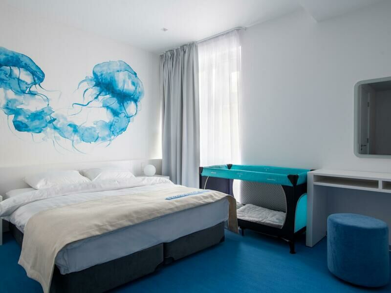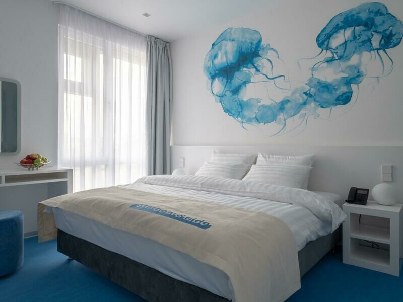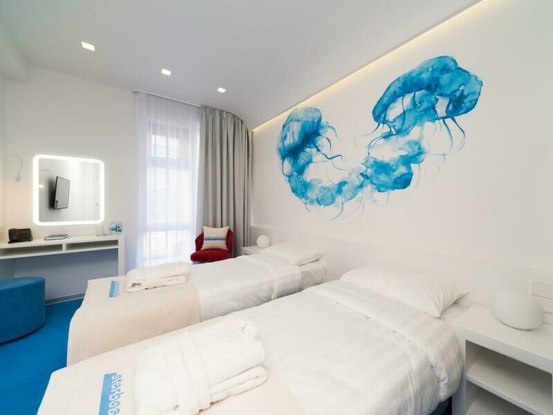 Стильный дизайн, всё выдержано в бело-голубых тонах, много света. Приятно было возвращаться в отель, особенно когда на улице дождь и всё серое, а внутри ярко и светло. Номер уютный и комфортный, всё продумано для удобства гостей.
