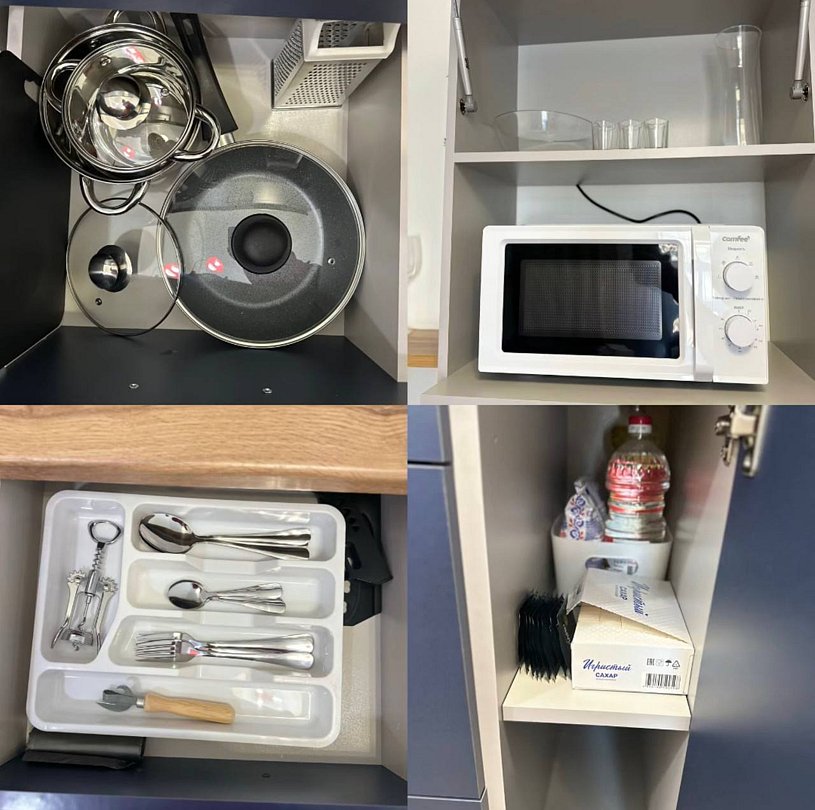 - Современная бытовая техника ( холодильник, микроволновка, индукционная плитка, стиральная машинка, утюг, фен)