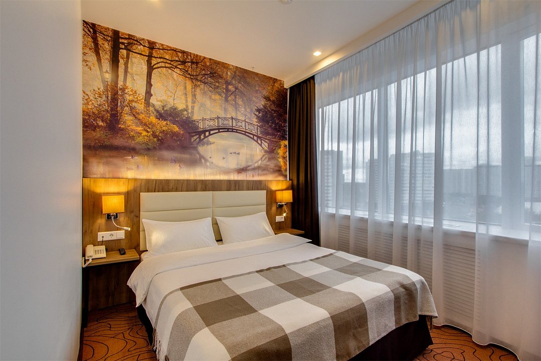 спутниковое телевидение, Wi-Fi, телефон, кондиционер, фен, будильник, электронные замки, ванная комната, халаты, банные полотенца, тапочки, косметические средства, двуспальная кровать, стулья, шкаф для одежды, вешалки, письменный стол, зеркало, чайный набор, набор посуды, обслуживание номеров, чайник, унитаз, раковина, ковровое покрытие, душ, вид на город, туалетные средства, телевизор с плоским экраном, без питомцевВ гостиничном номере