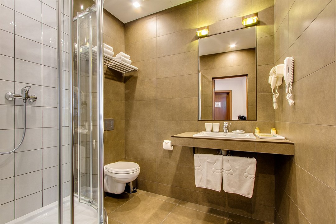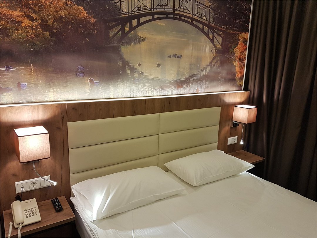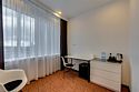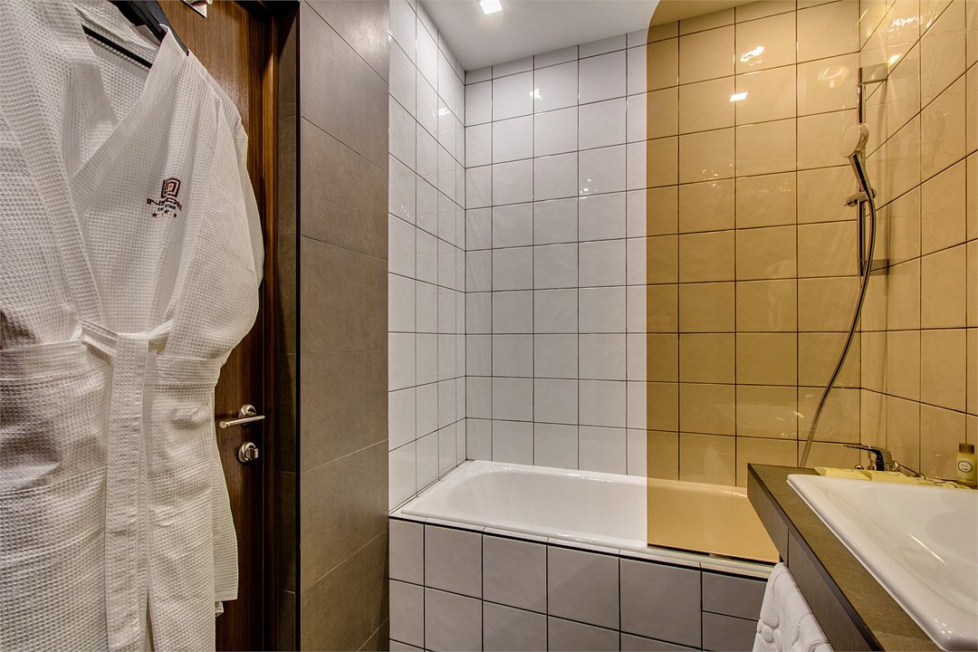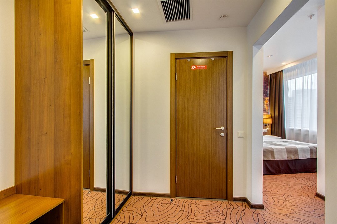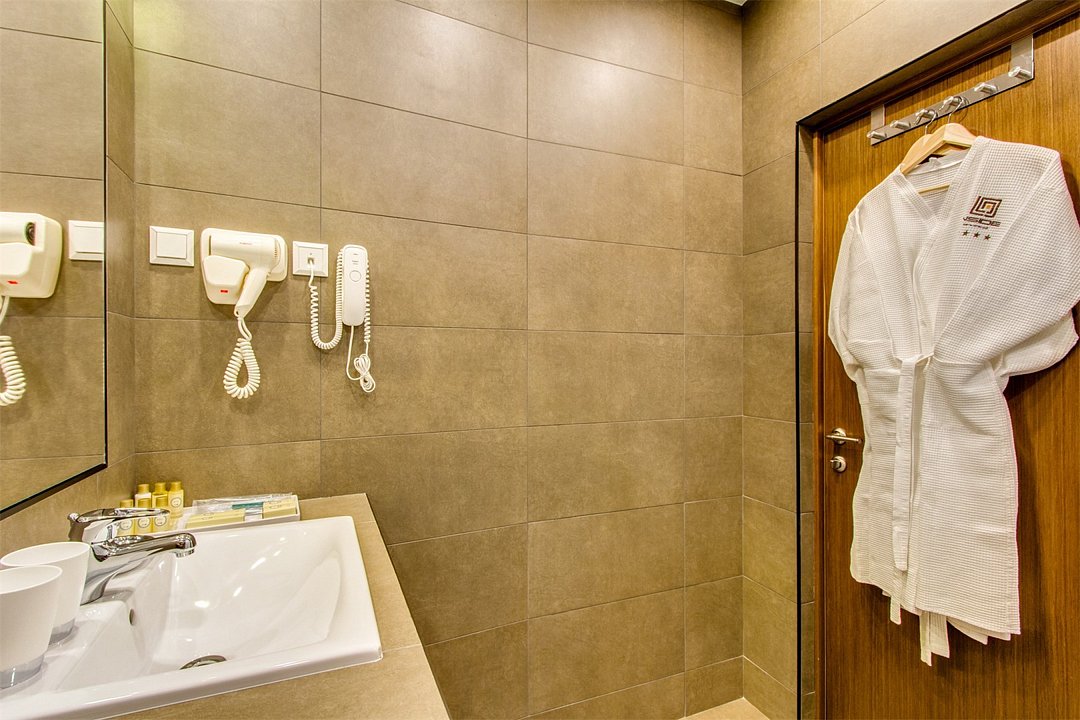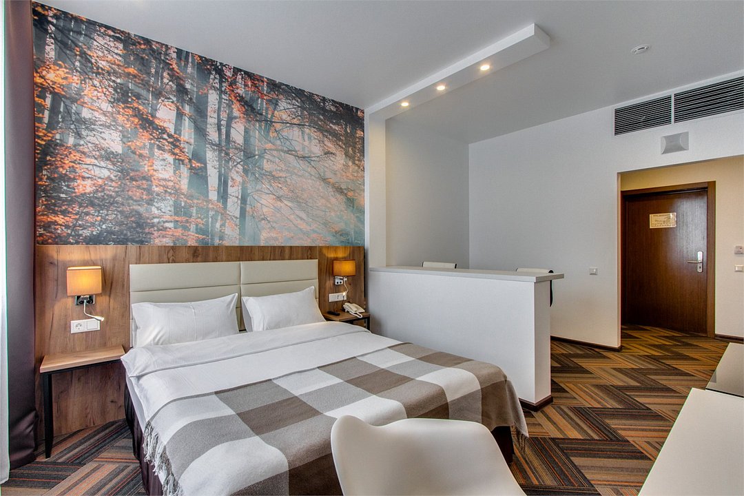 В номере: двуспальная кровать 160x200, прикроватные тумбы, плазменный ТВ, спутниковое телевидение, бесплатный WiFi В гостиной зоне – кондиционер, телефон, письменный стол, кресло, холодильник, чайник. На полу - ковровое покрытие При входе: гардеробная комната Санузел: ванна, фен, халаты, тапочки, необходимые туалетные принадлежностиУслуги и удобства